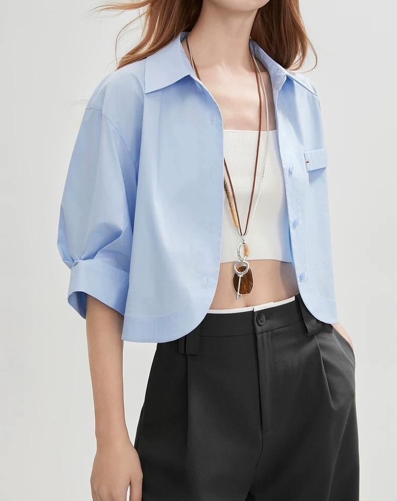 ELEL 法式通勤风短款蓝衬衫女25夏季新款设计感宽松休闲上衣