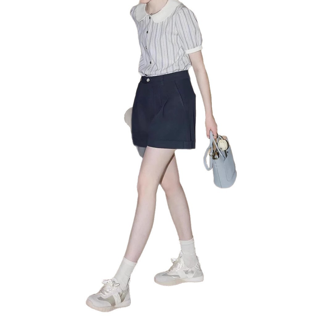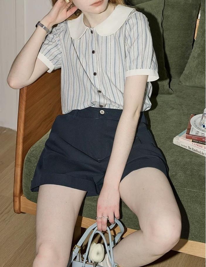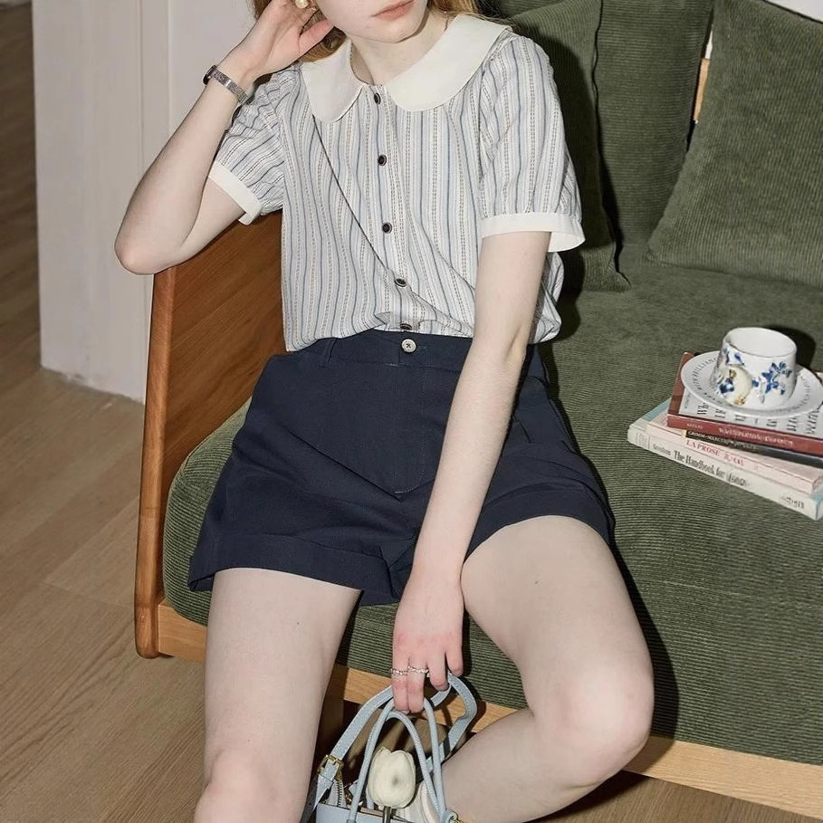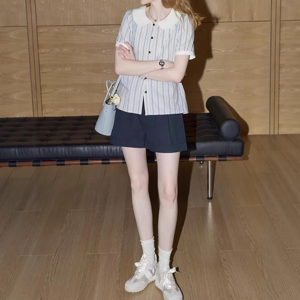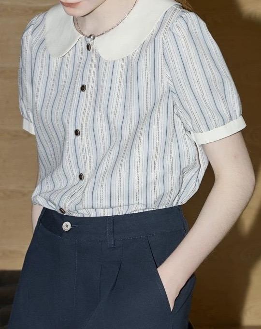 初恋风娃娃领条纹短袖棉衬衫女25年夏季新款甜美减龄衬衣