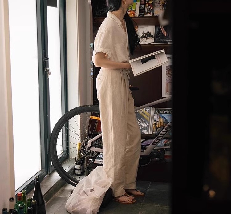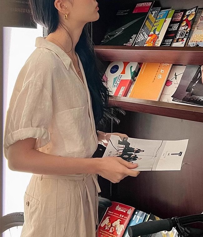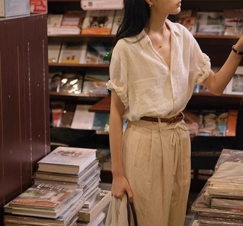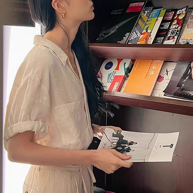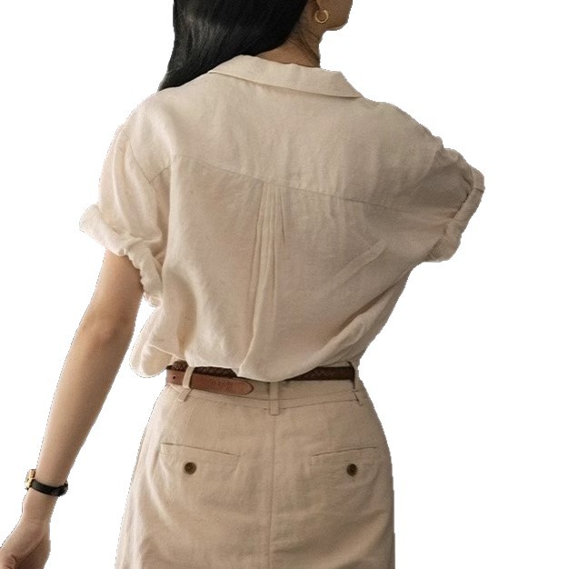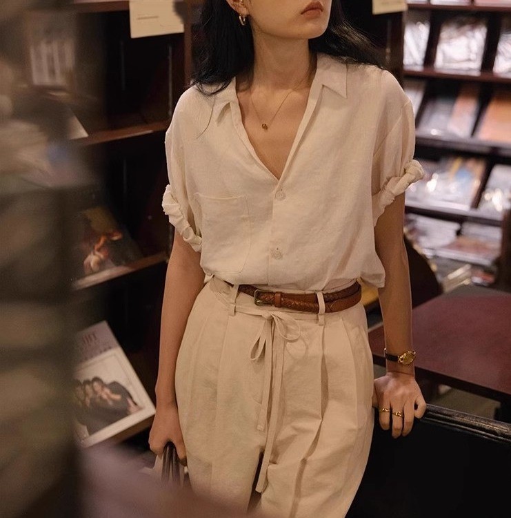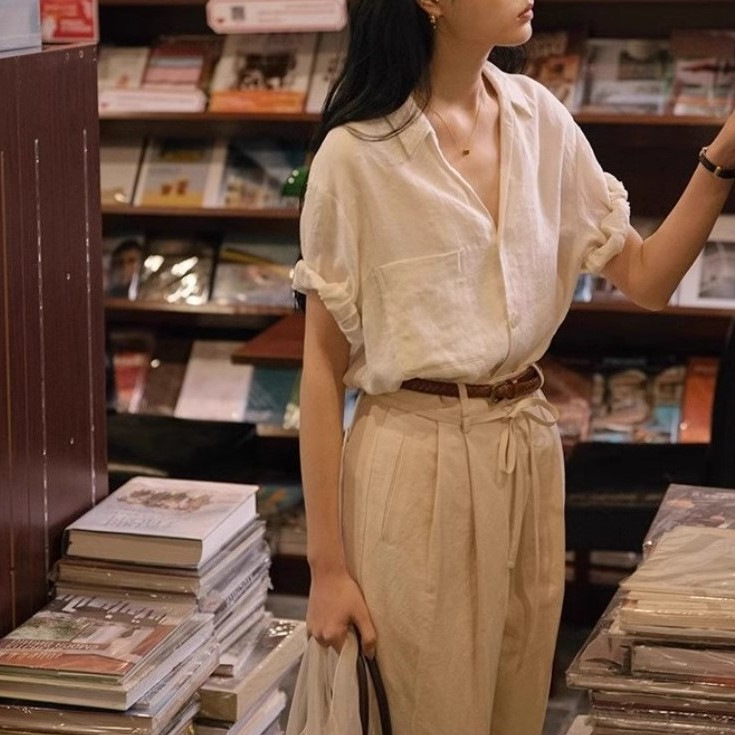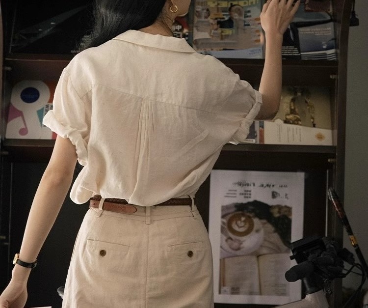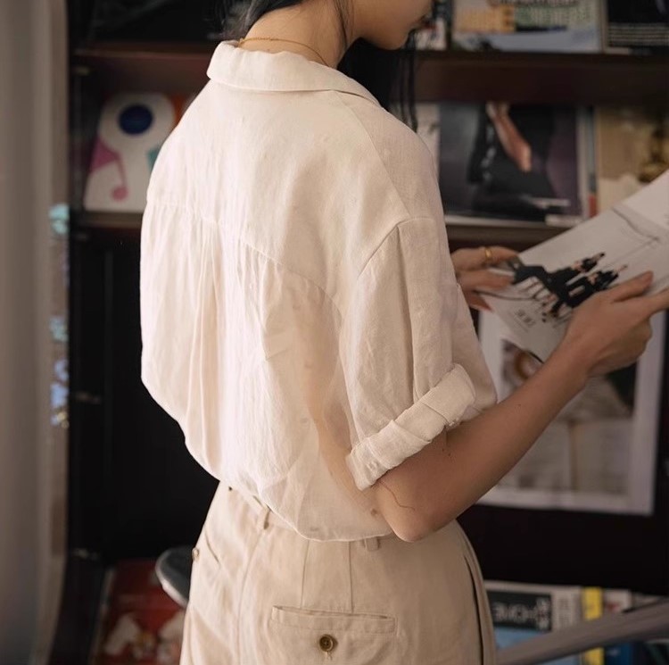 复古少女松弛感宽松古巴领亚麻圆点提花苞袖衬衫上衣女夏新款