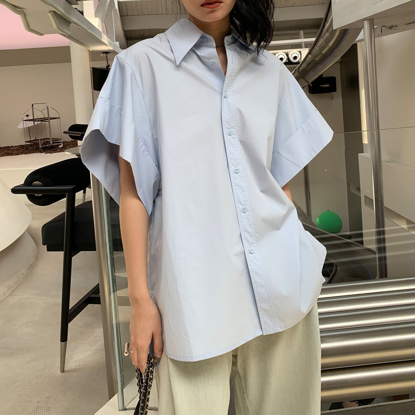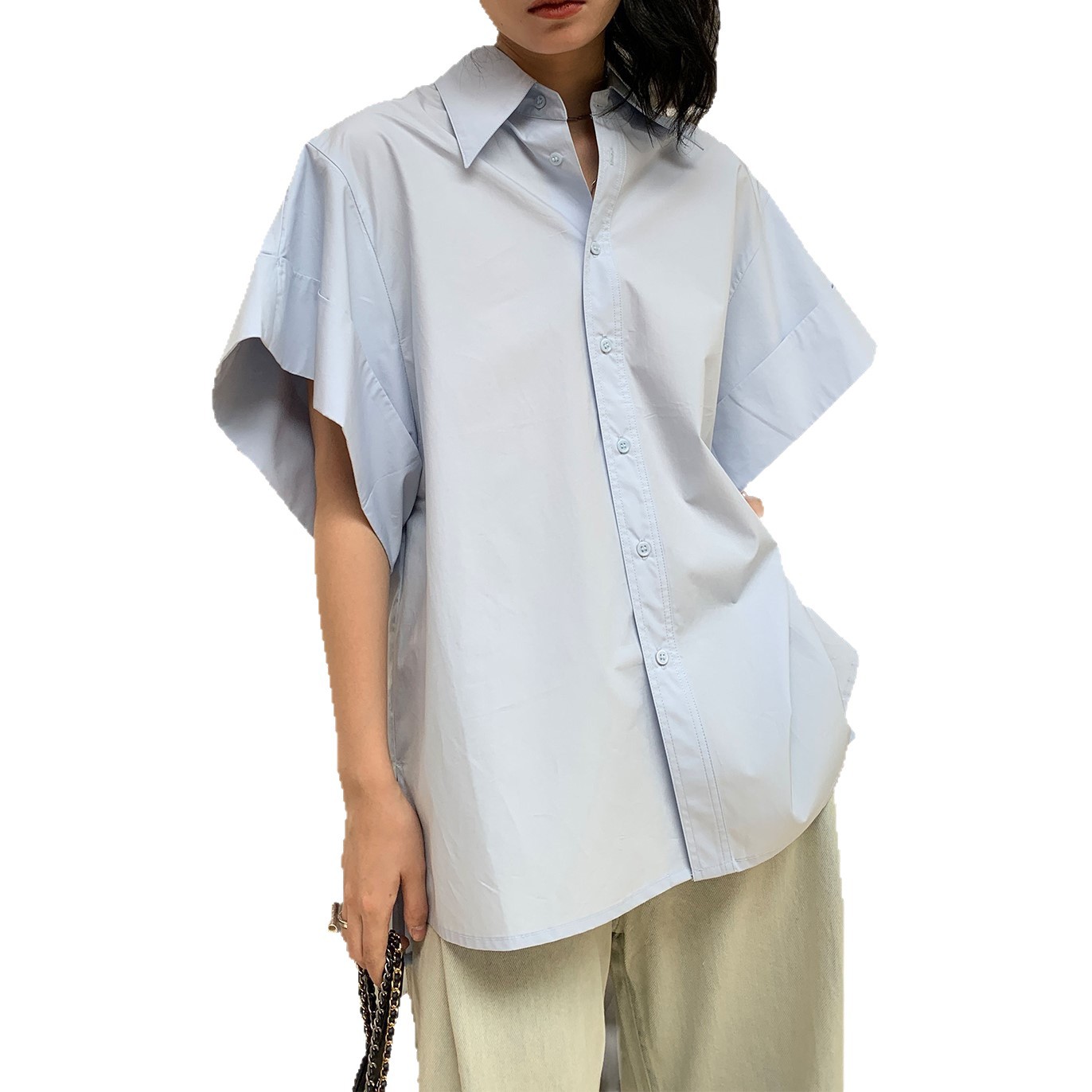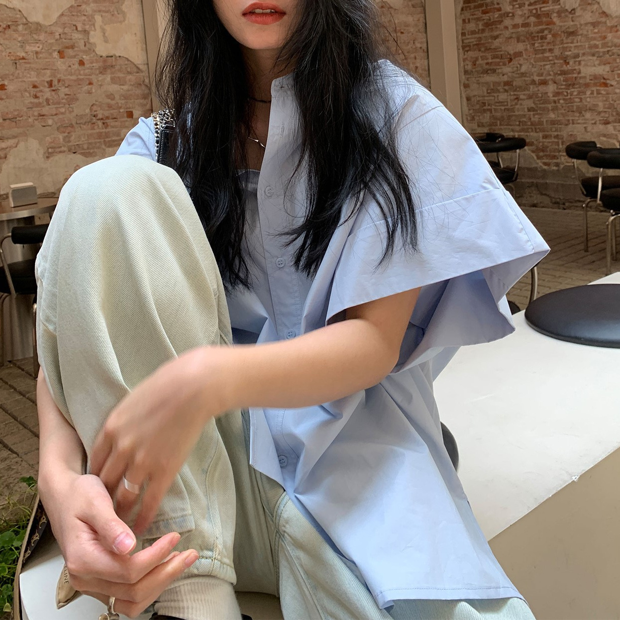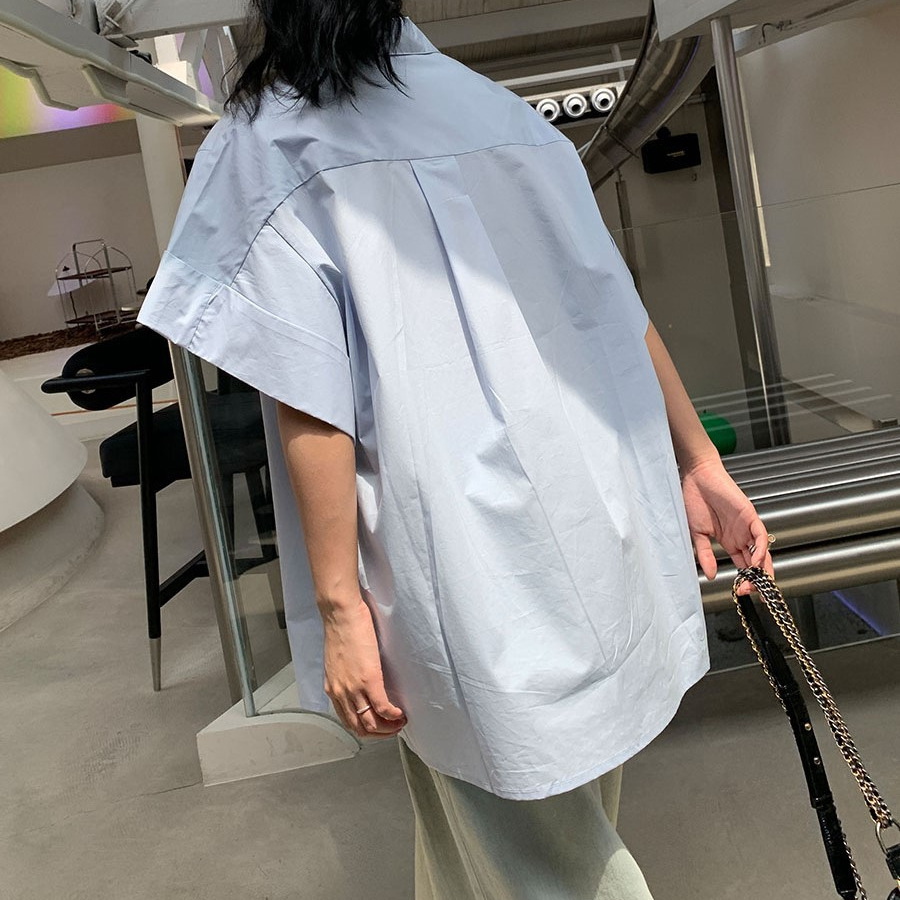 ins潮流时尚衬衫女25夏季百搭新款纯色蓝色韩版宽松上衣