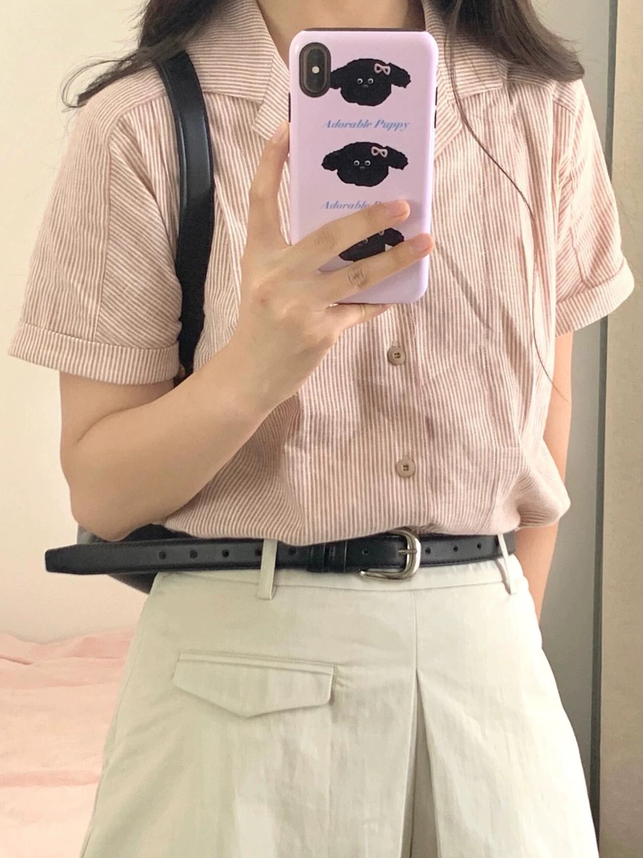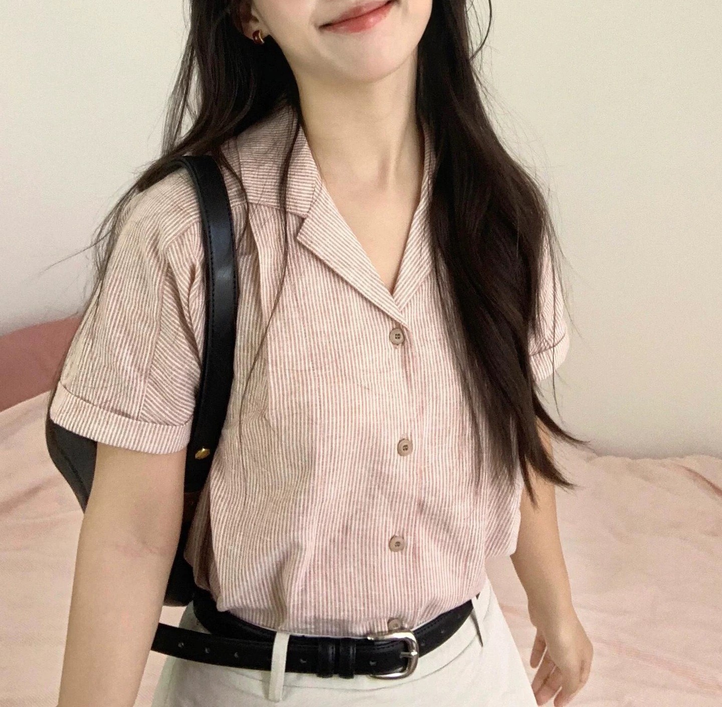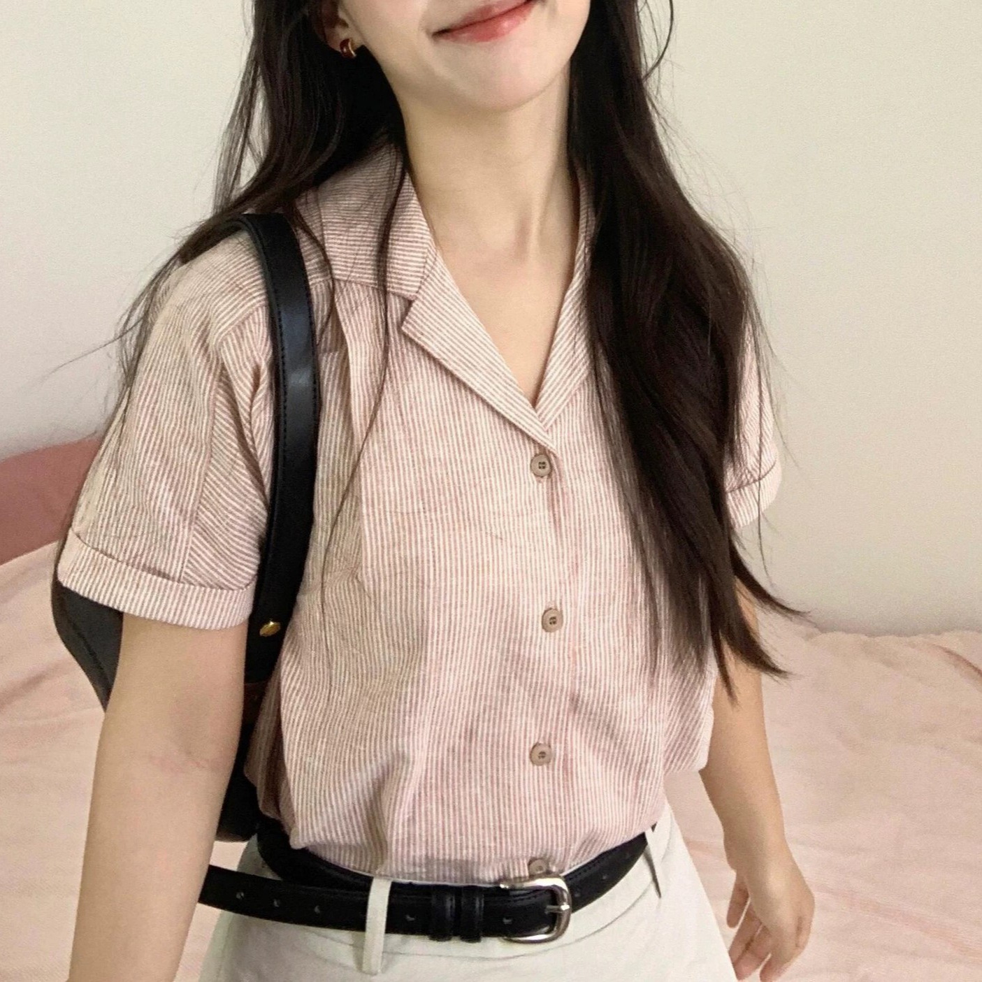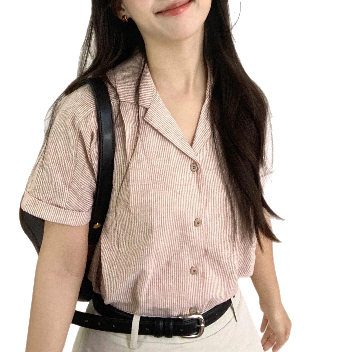 脏粉色日系文艺风古巴领条纹短袖衬衫女夏25宽松半袖好看衬衣上衣