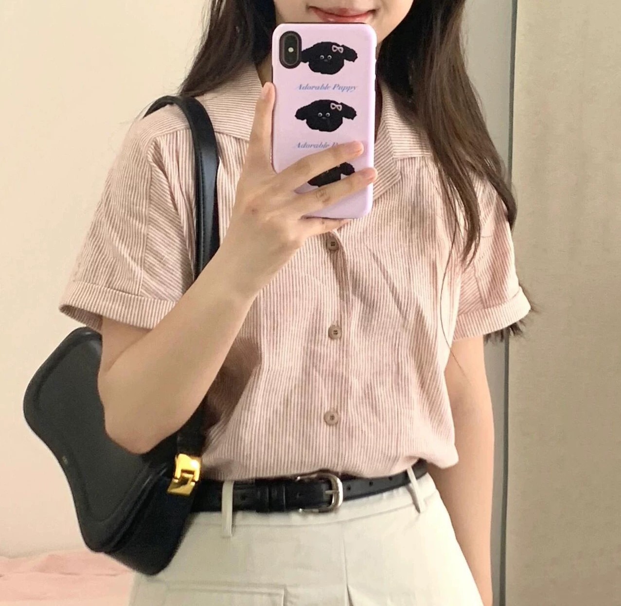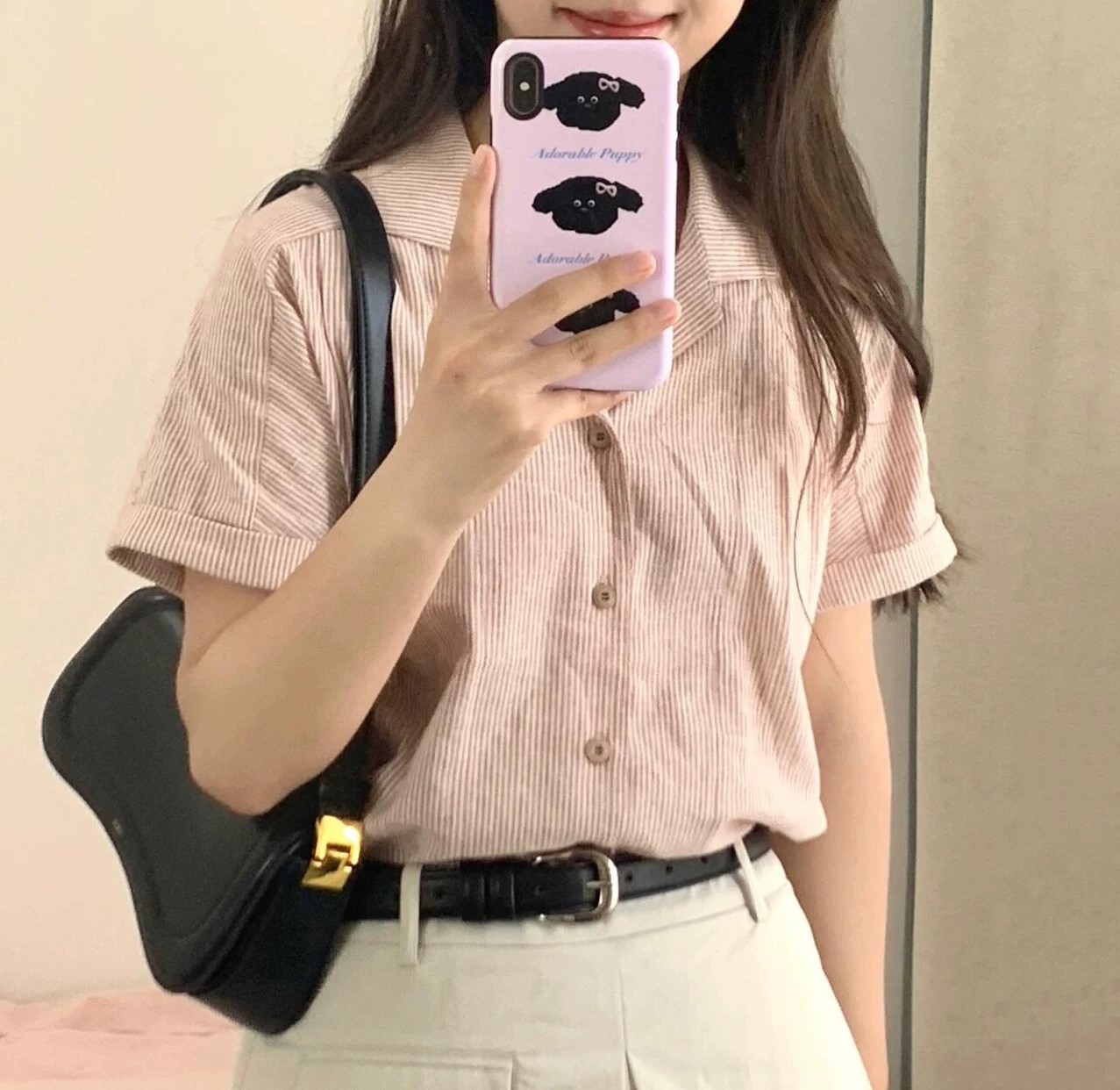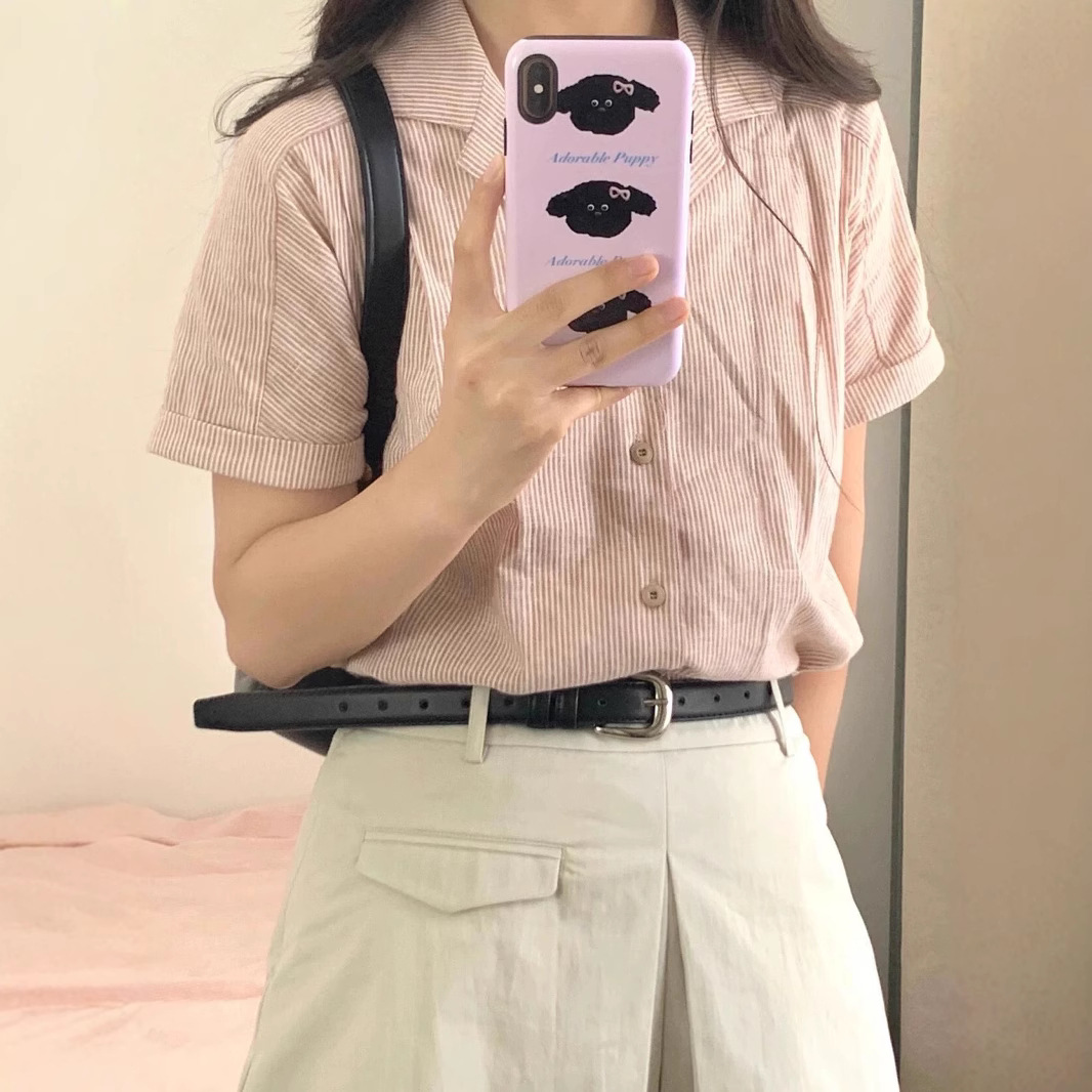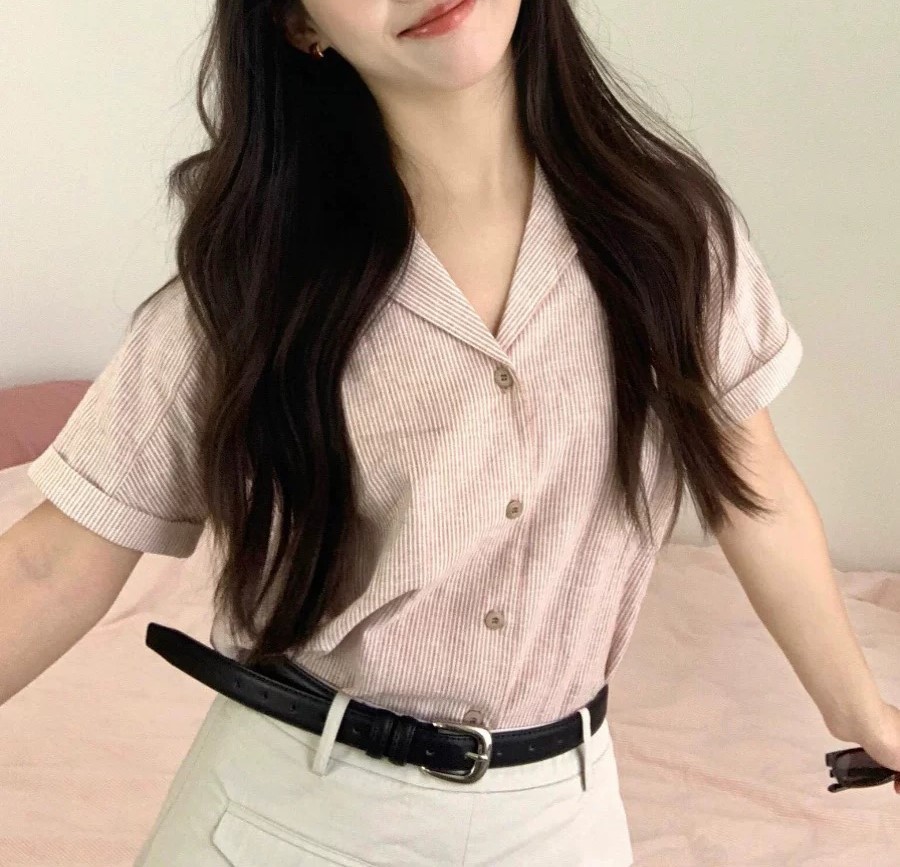 脏粉色日系文艺风古巴领条纹短袖衬衫女夏25宽松半袖好看衬衣上衣