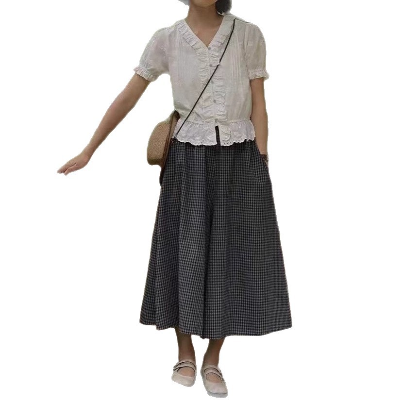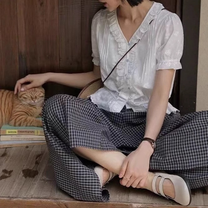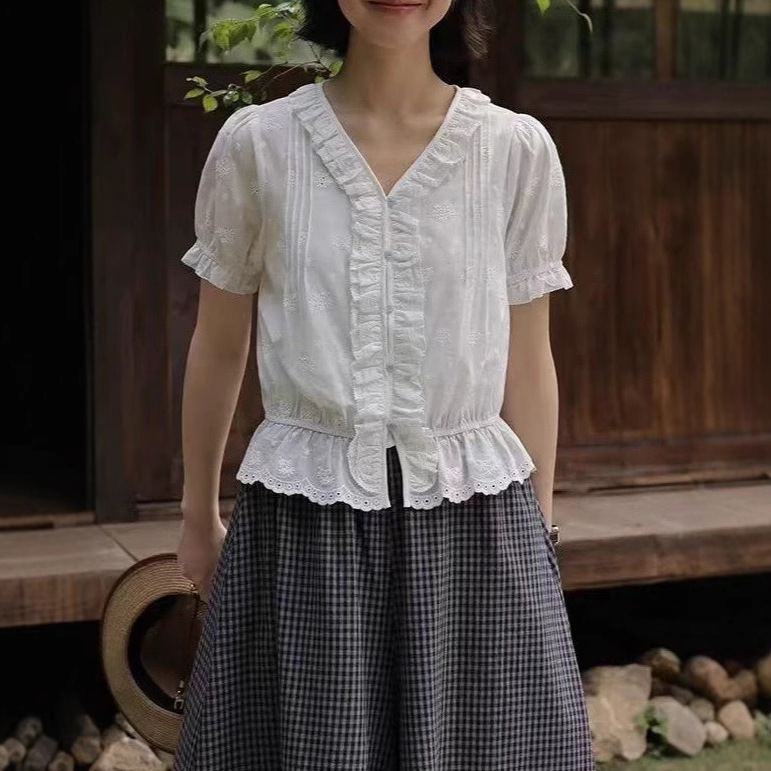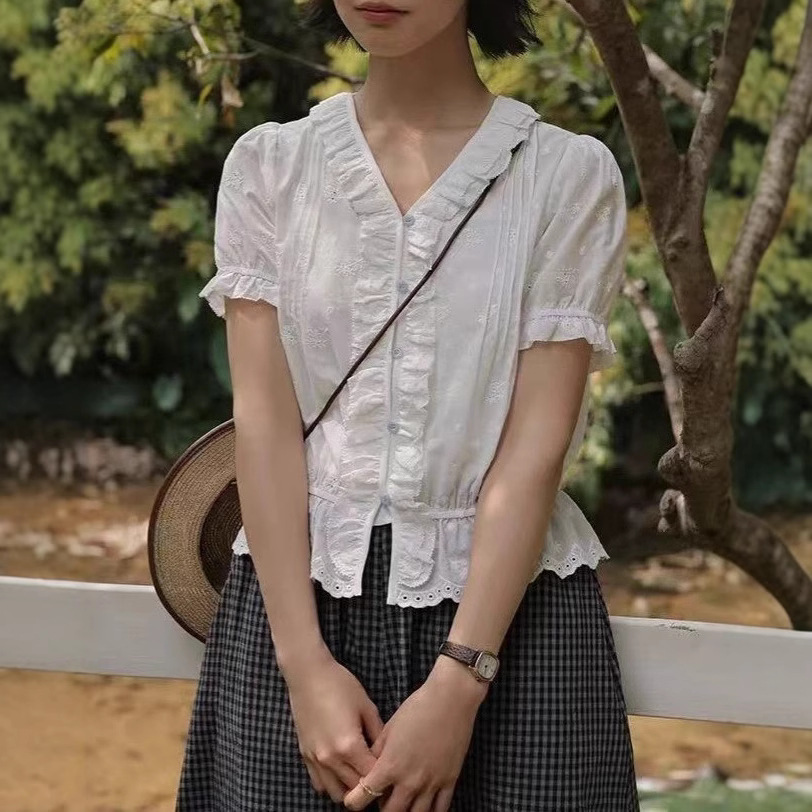 日系复古花边V领短袖衬衫女25夏季设计感小众小衫小个子衬衣