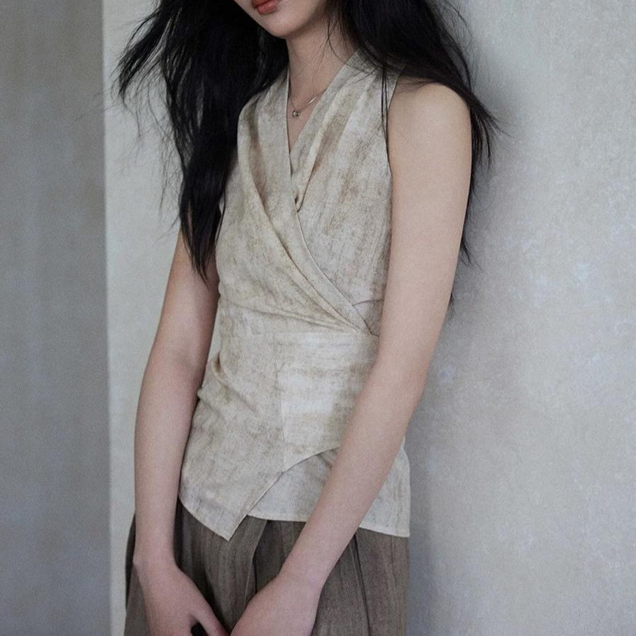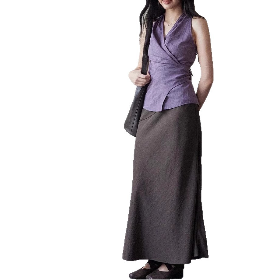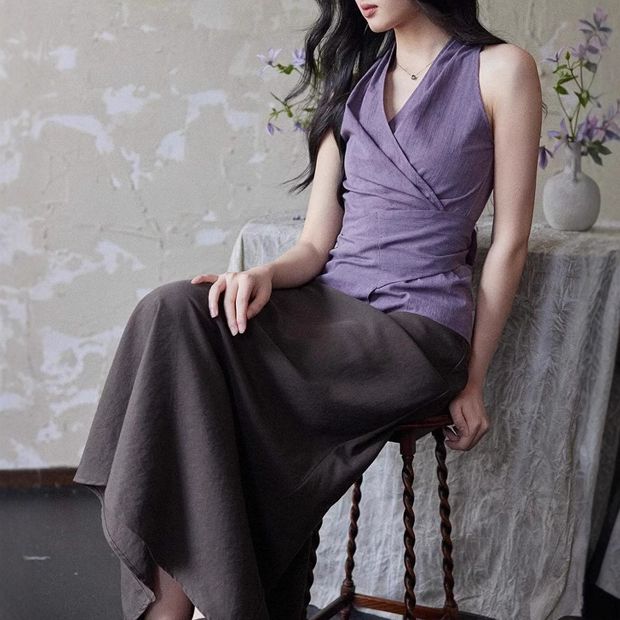贰羊设计【禾夏】气质紫色v领挂脖上衣女25设计感绑带无袖小衫