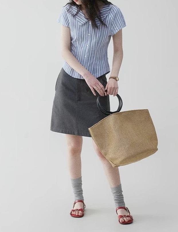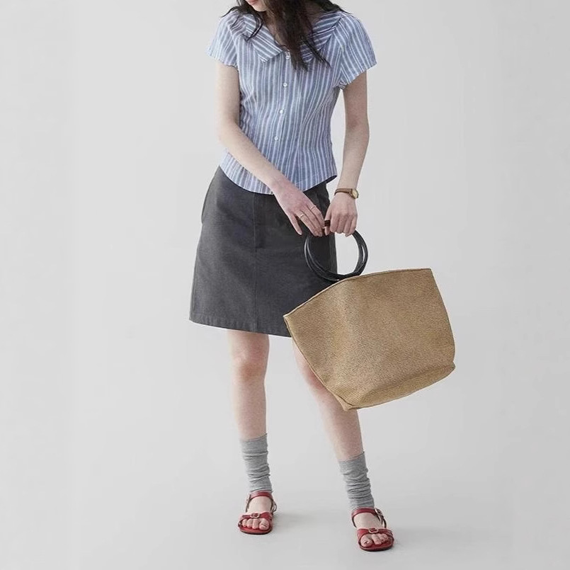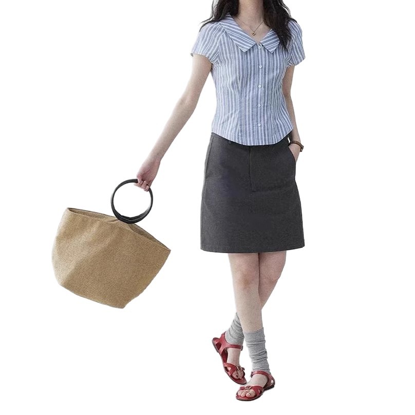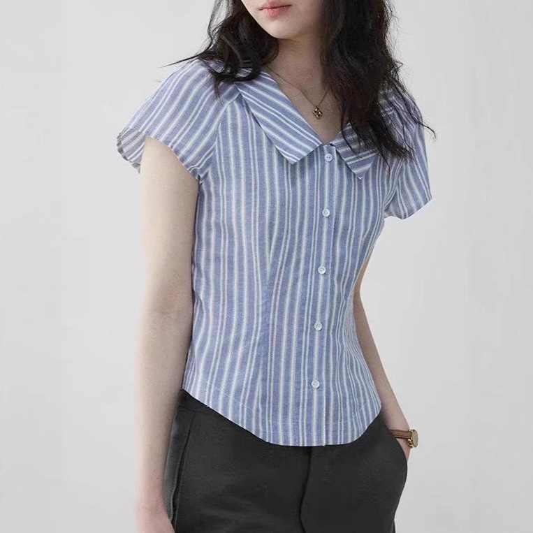 VOEO法式撞色条纹收腰显瘦衬衫女夏季新款翻领文艺上衣