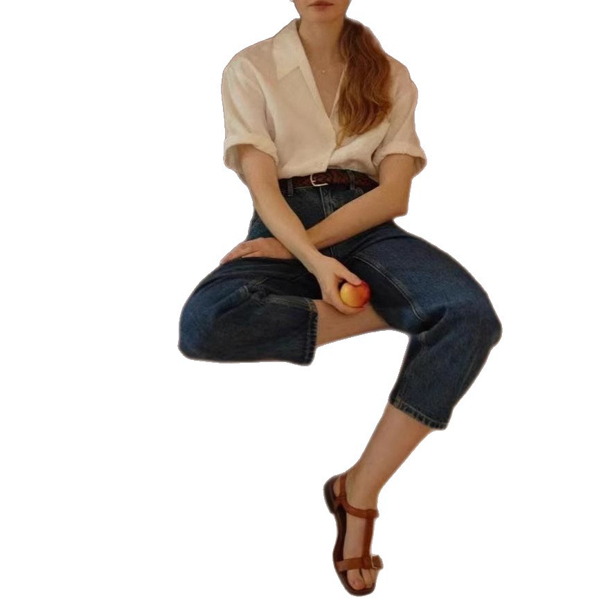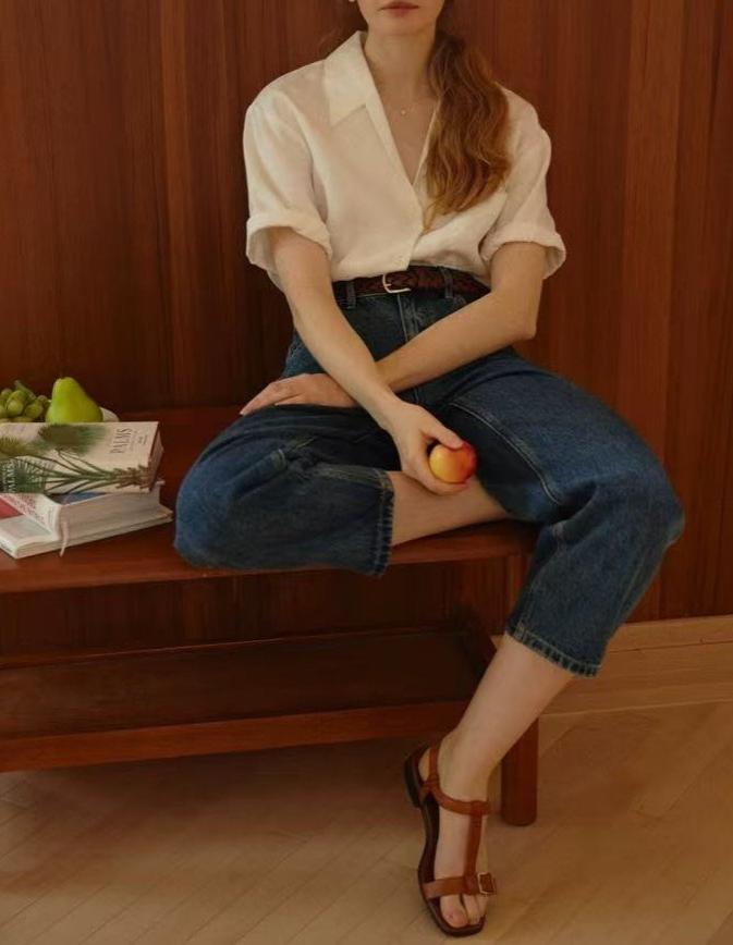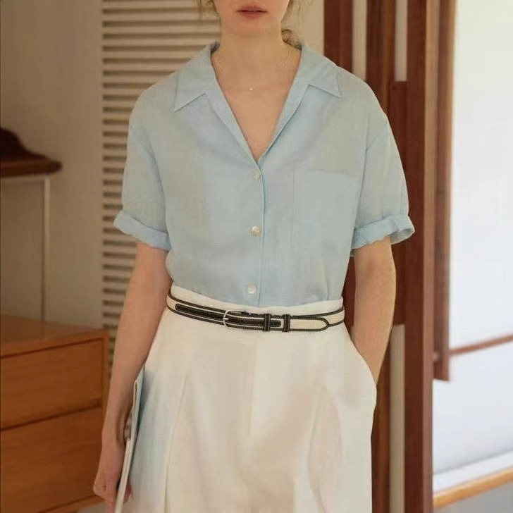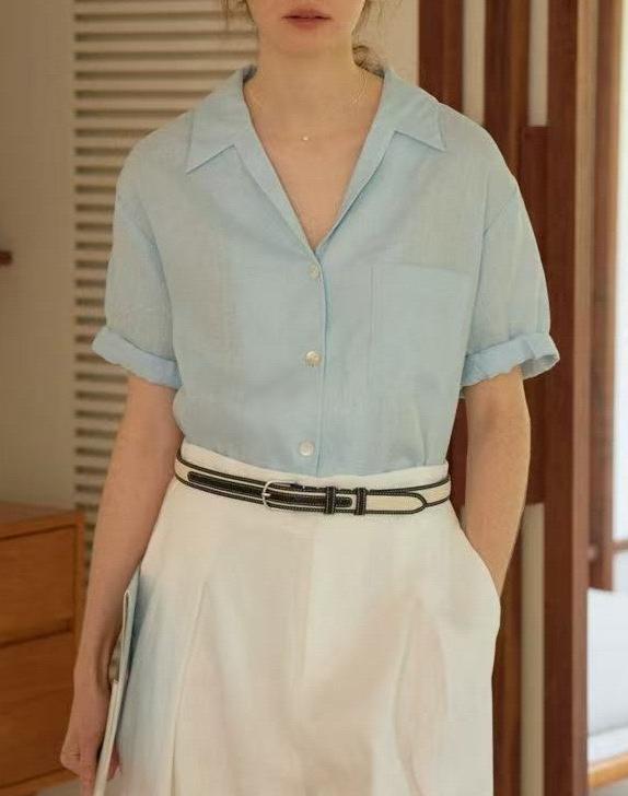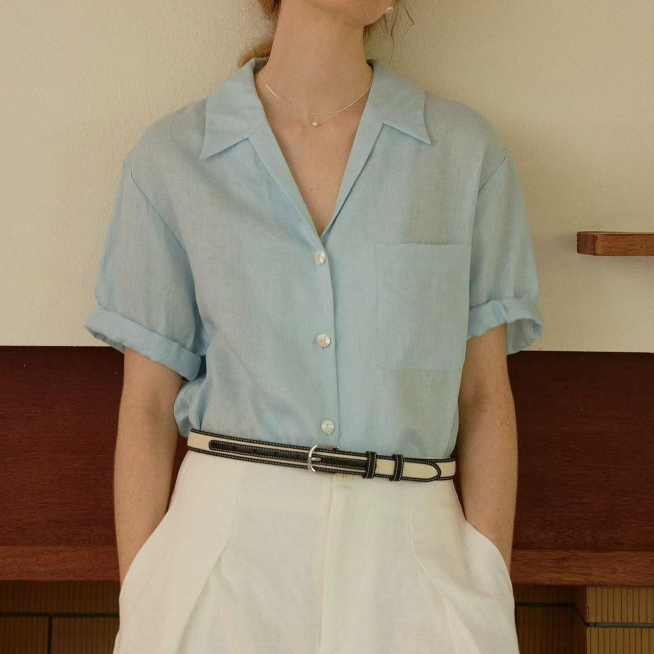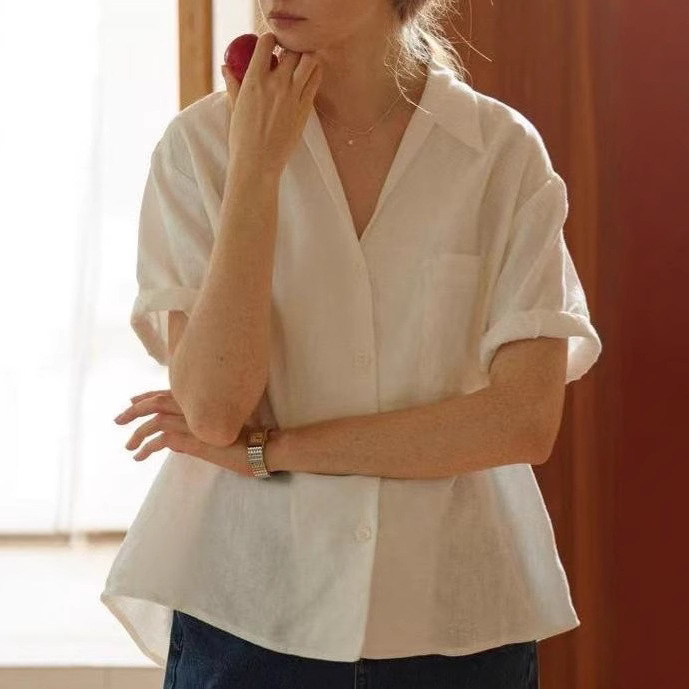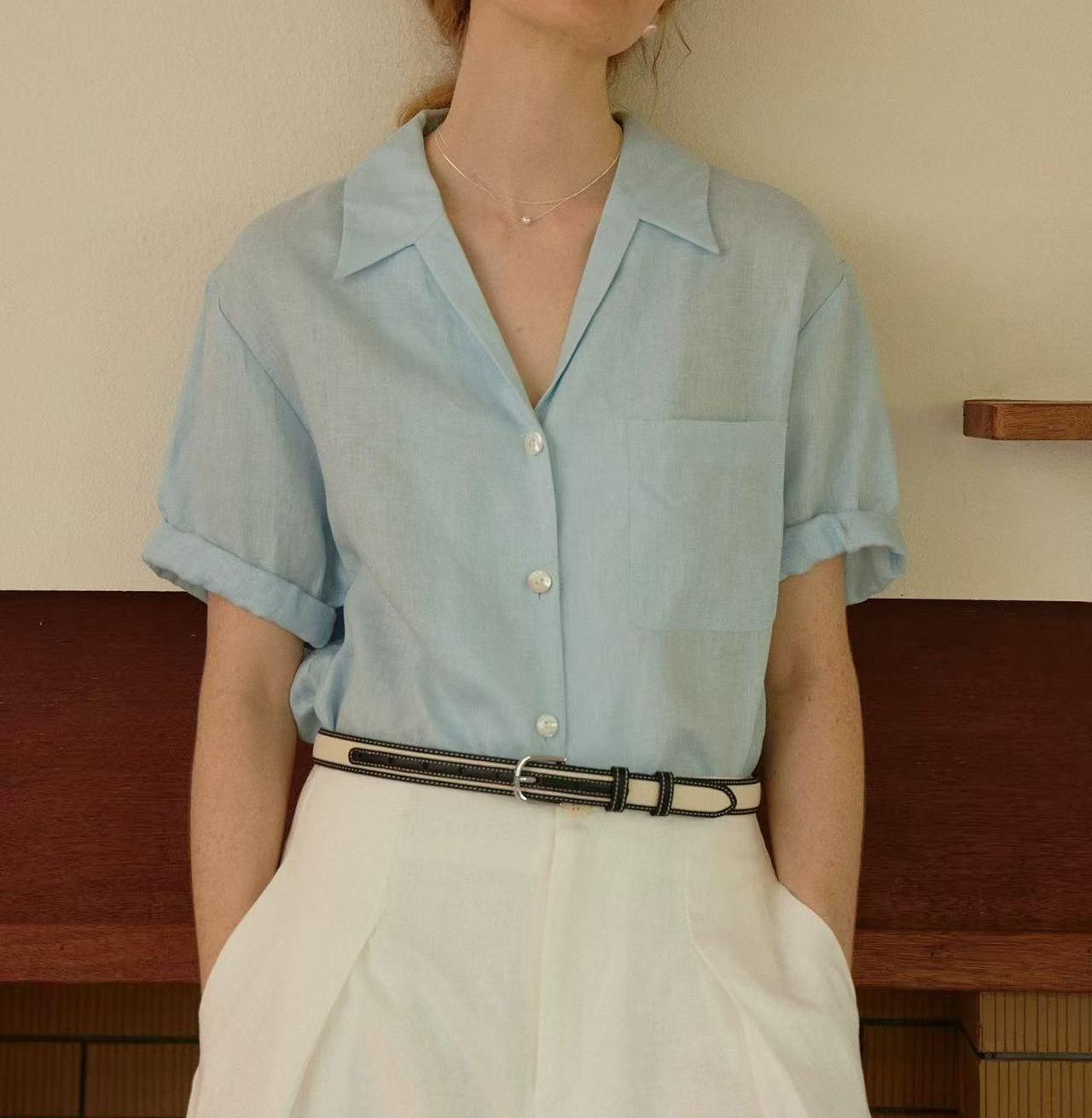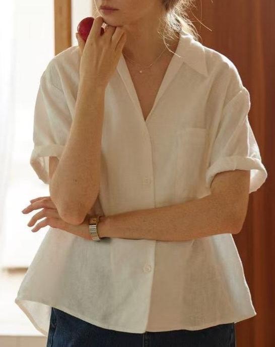 法式Chic古巴领亚麻卷边袖深V宽松短袖衬衫 两色 夏女气质新款
