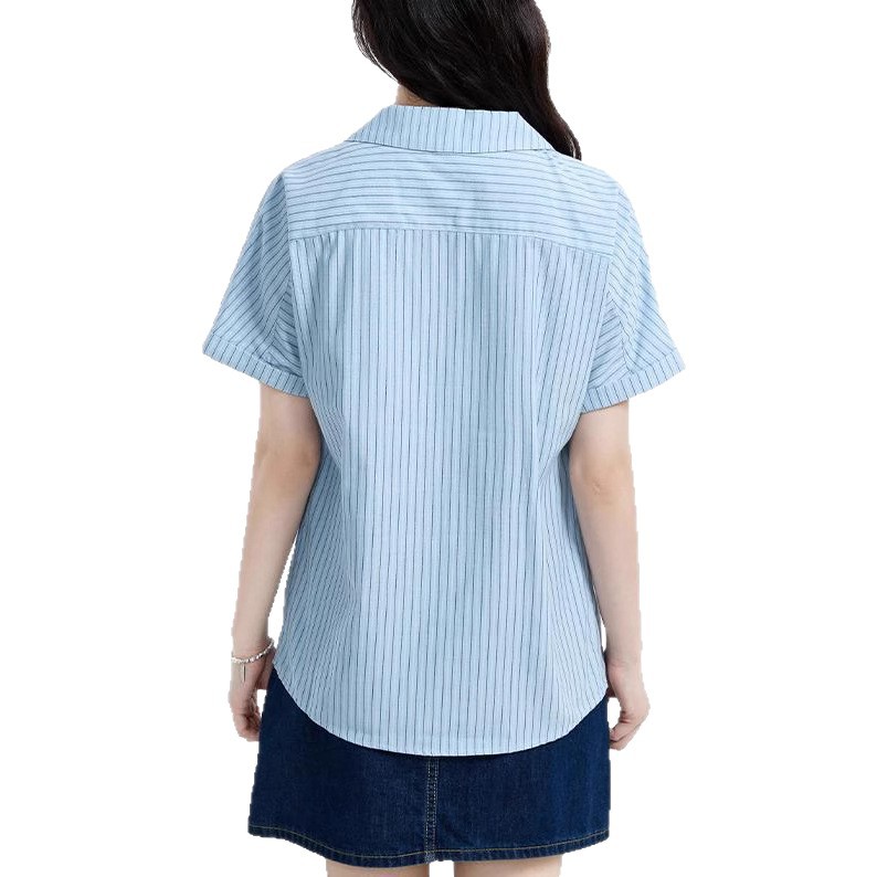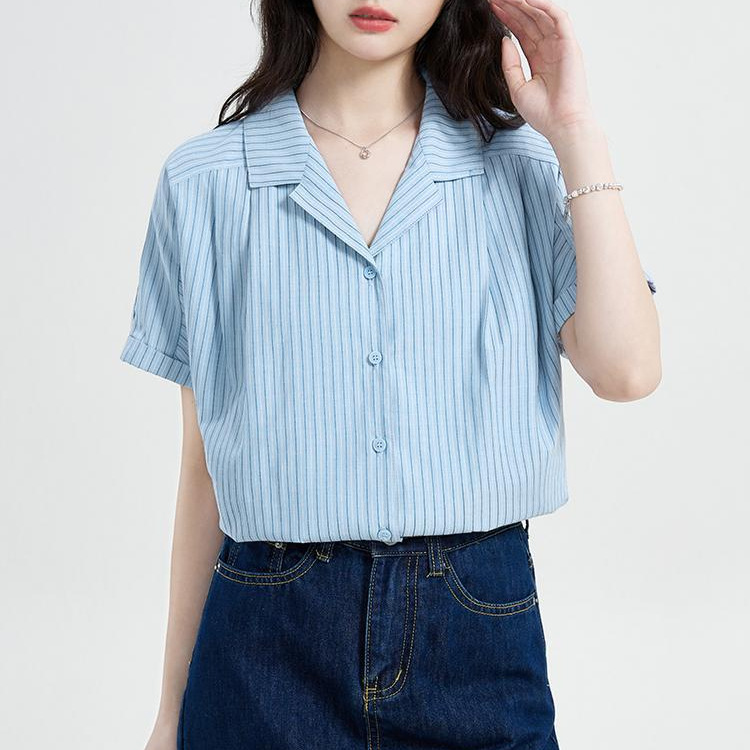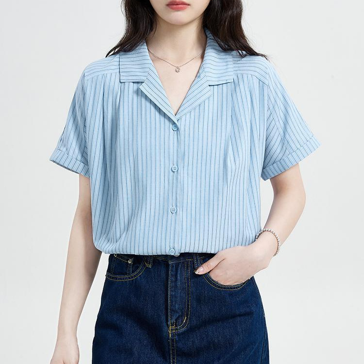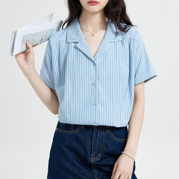 夏日必备~法式条纹西装领短袖衬衫女设计感小众宽松衬衫通勤上衣