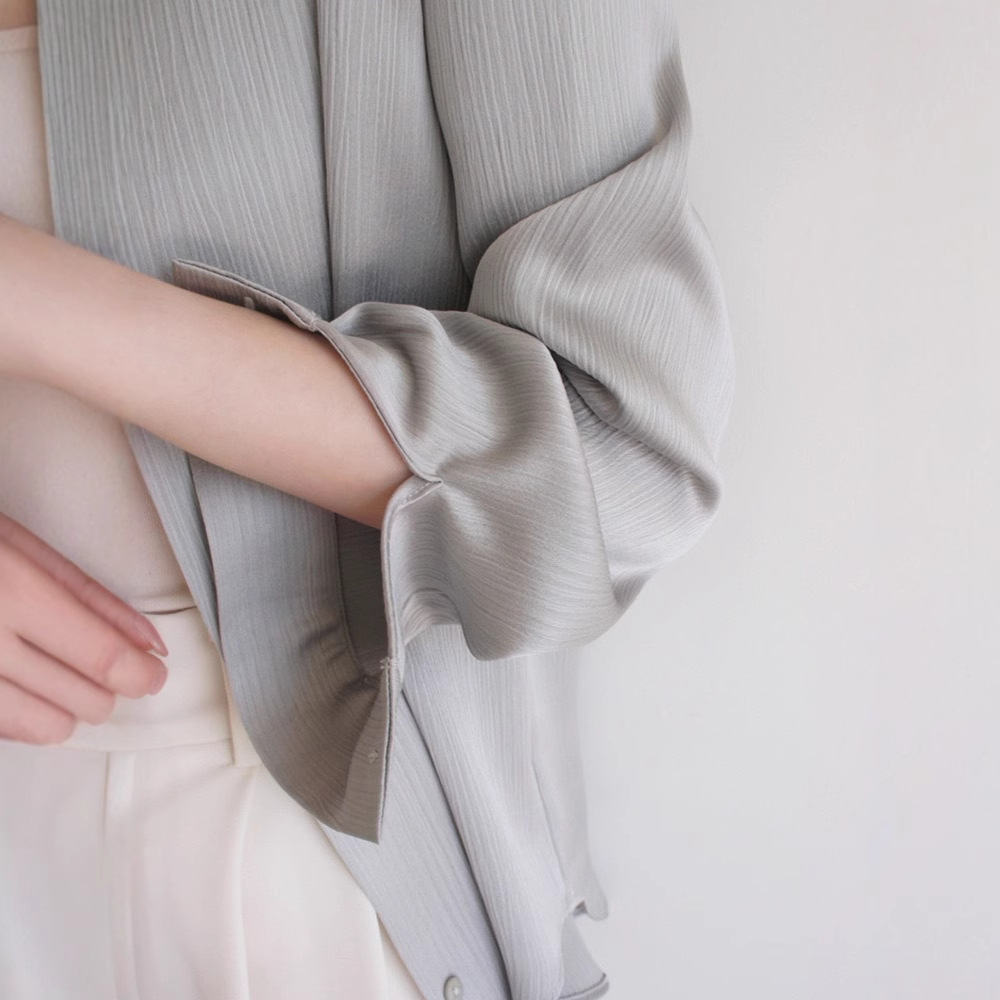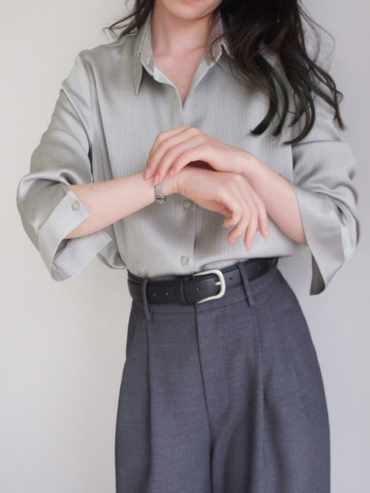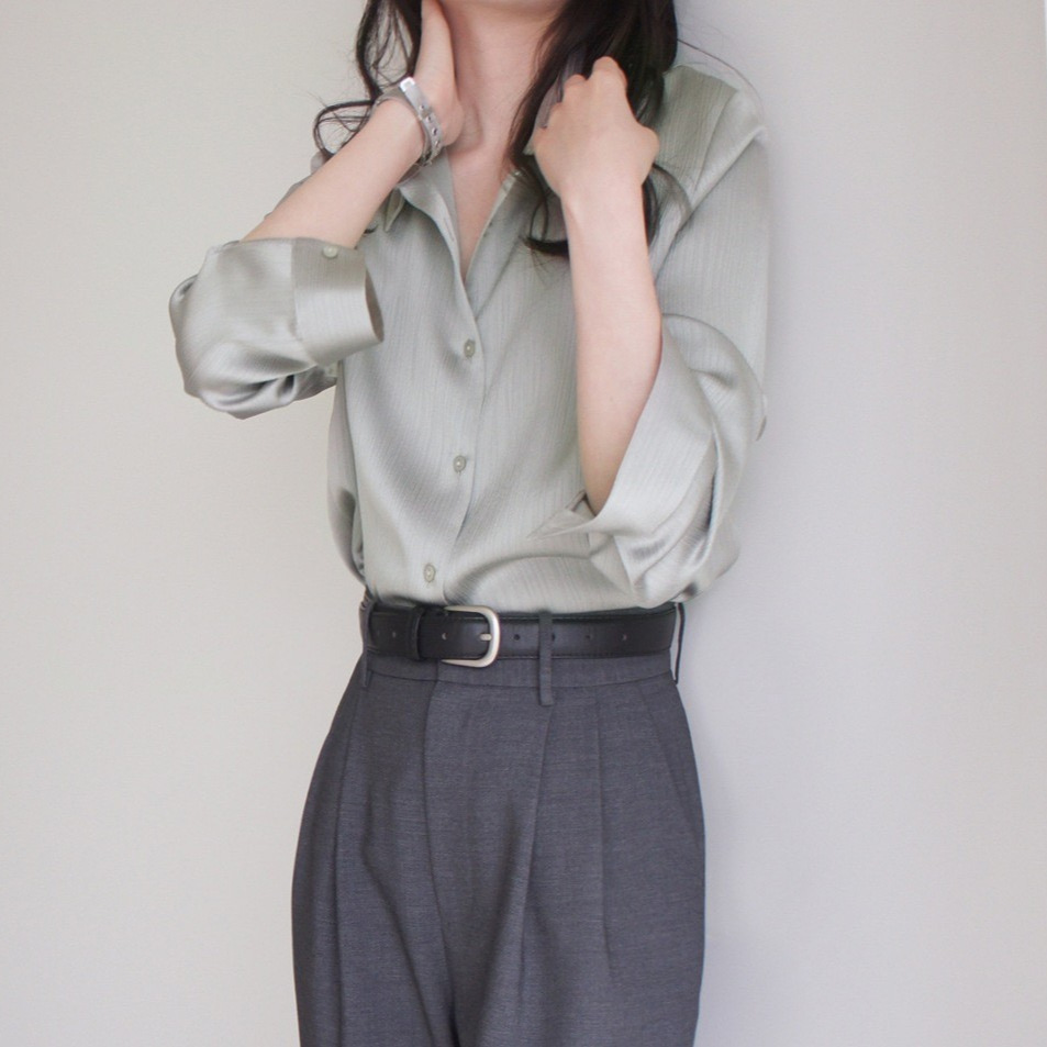 LOST AND FUOND灰调豆绿竖纹丝缎哑光暗纹长袖衬衫高级通勤质感女