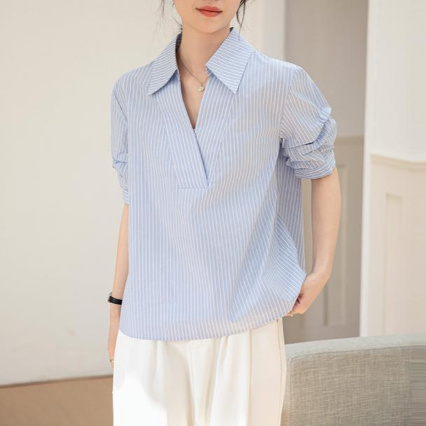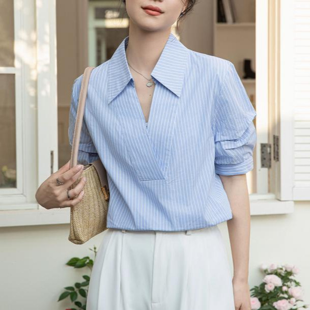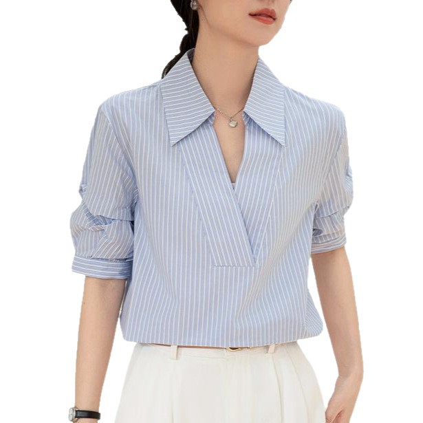 蓝色条纹衬衫女2025年夏新款立体翻领宽松打褶通勤职业短袖上衣