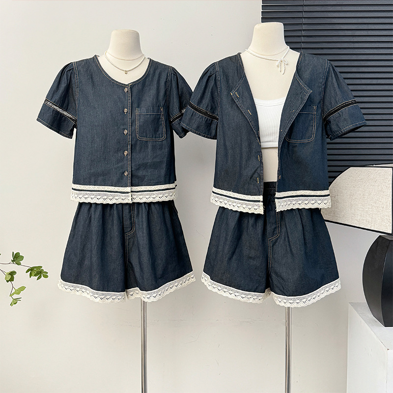 复古蕾丝拼接泡泡袖圆领牛仔衬衫女夏季时尚减龄阔腿休闲短裤套装