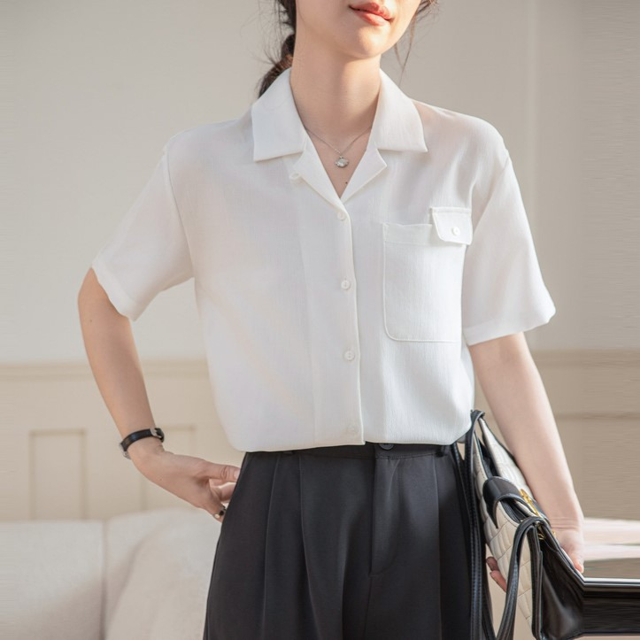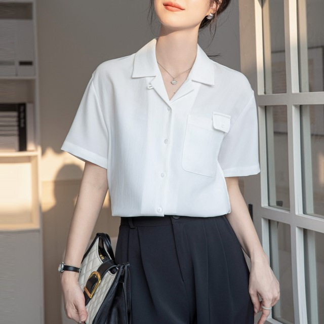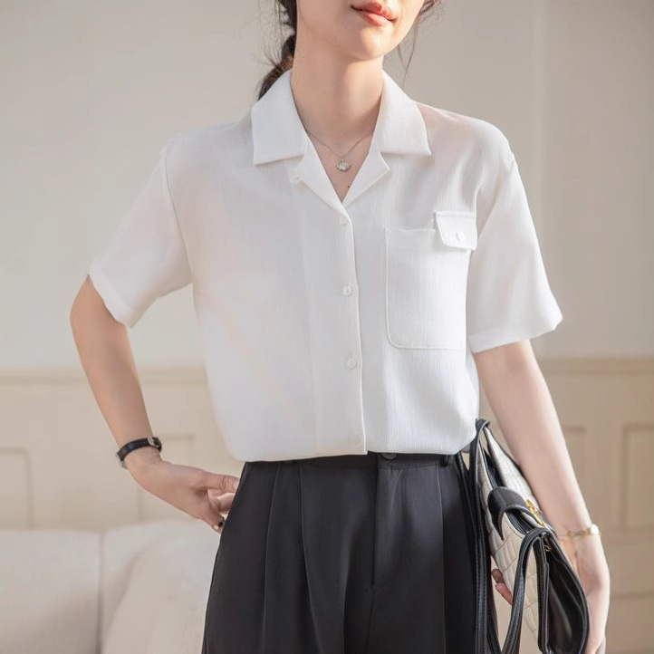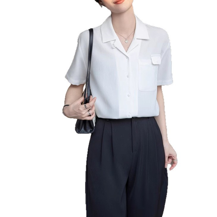 白色小袋盖设计感短袖衬衫女2025夏季职业通勤休闲别致衬衣上衣
