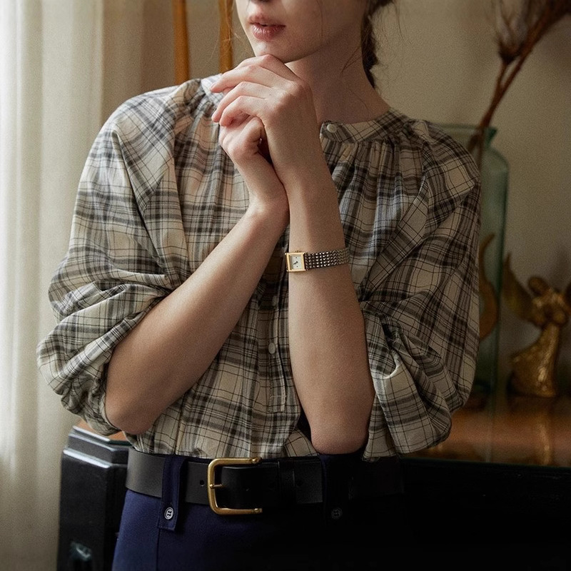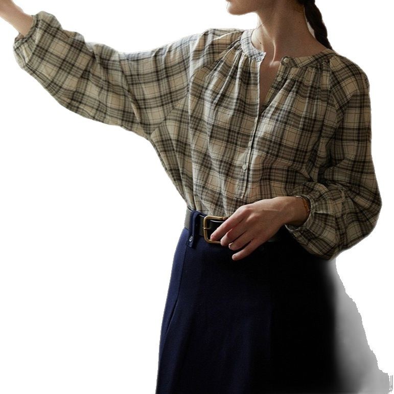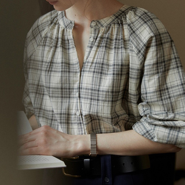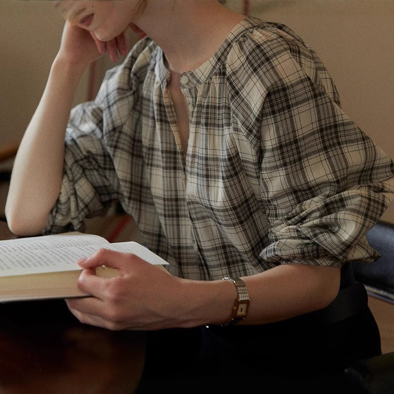 黑白格纹衬衫宽松圆领廓形衬衫女夏季气质新款百搭上衣