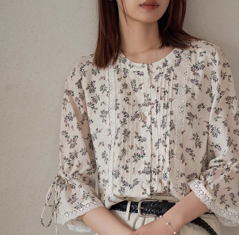 「白描」'杜乐丽花园'夏季精梳棉法式少女碎花蕾丝衬衫新款