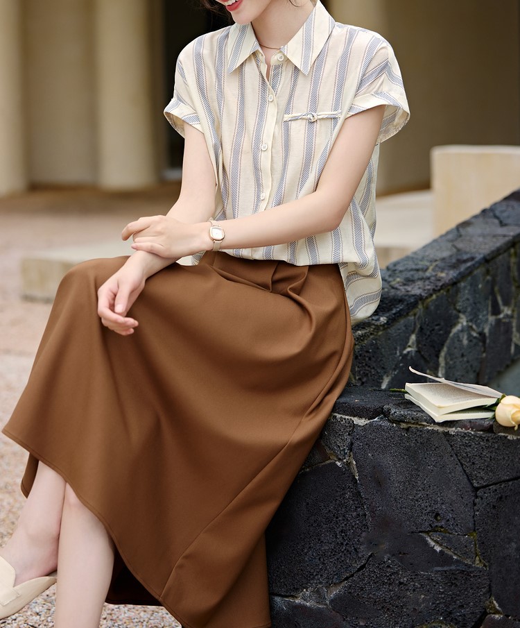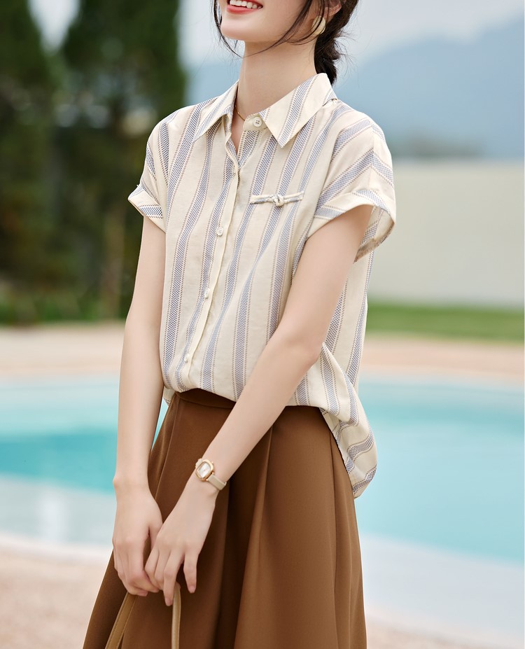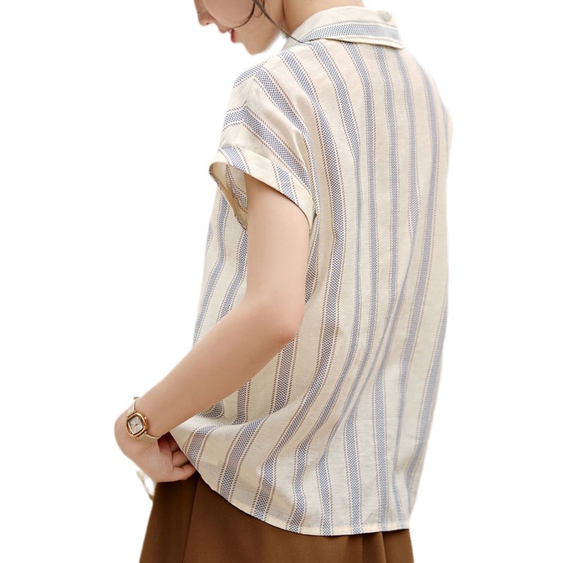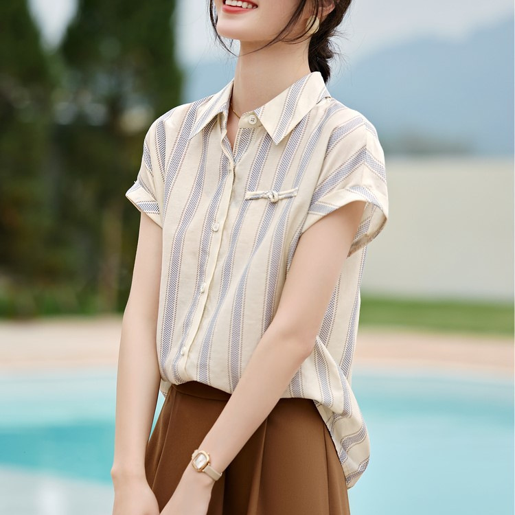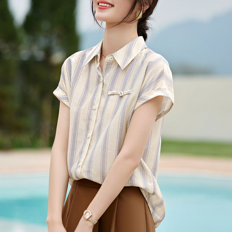 连肩袖设计条纹衬衫女夏季优雅气质高级通勤简约衬衣短袖上衣