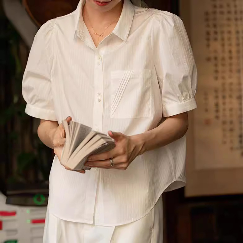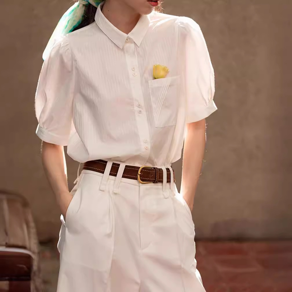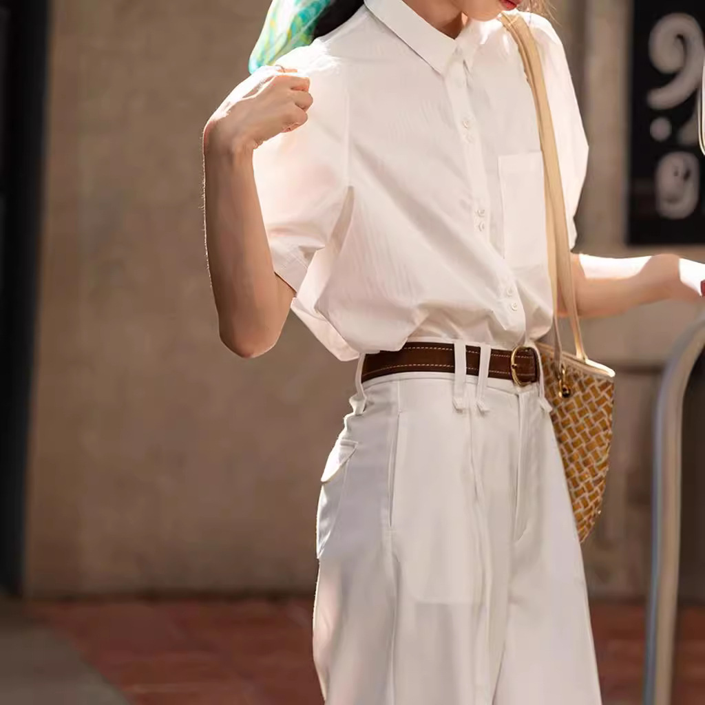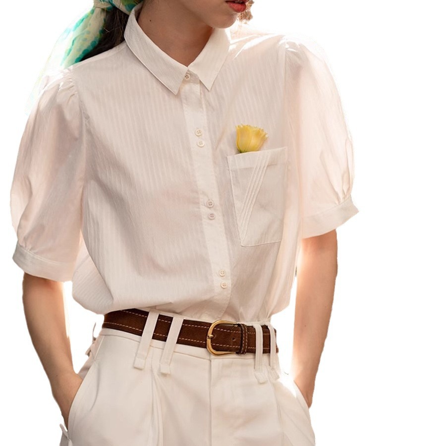 纯色白色小翻领短袖经典衬衫女夏季气质小清新高级质感上衣