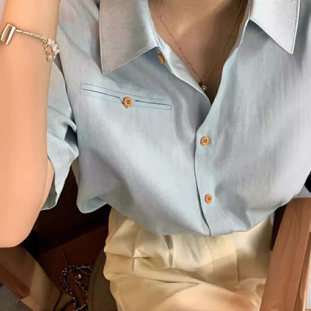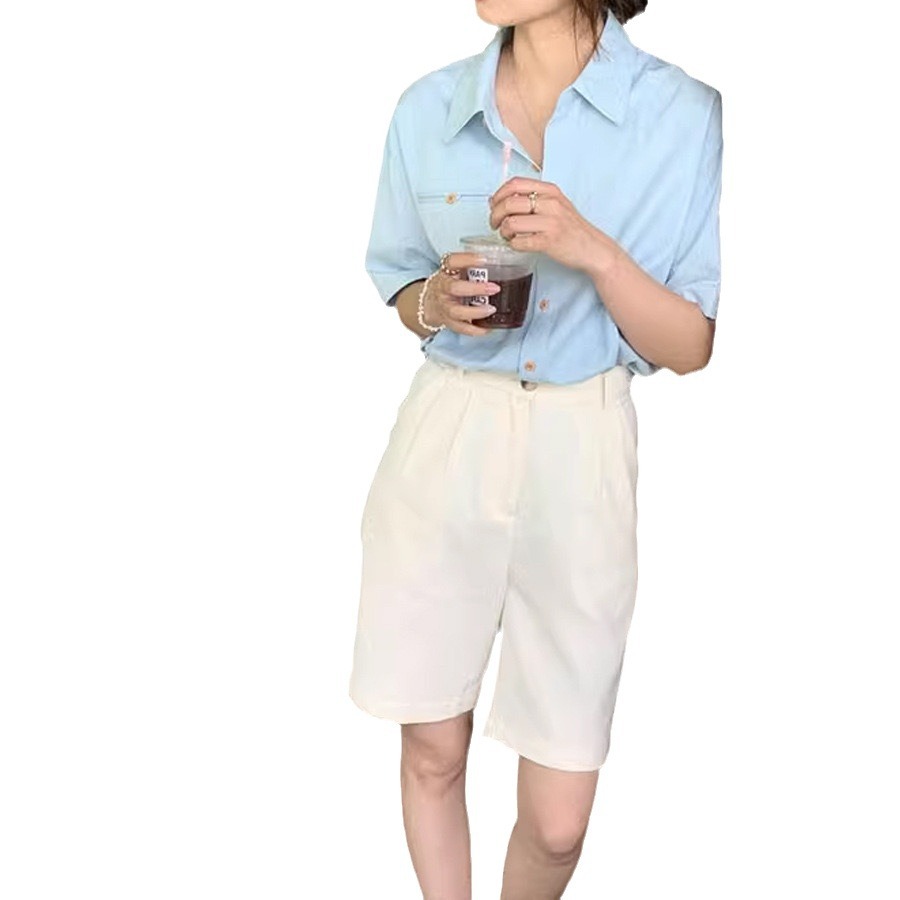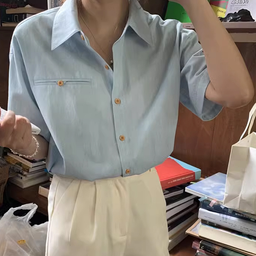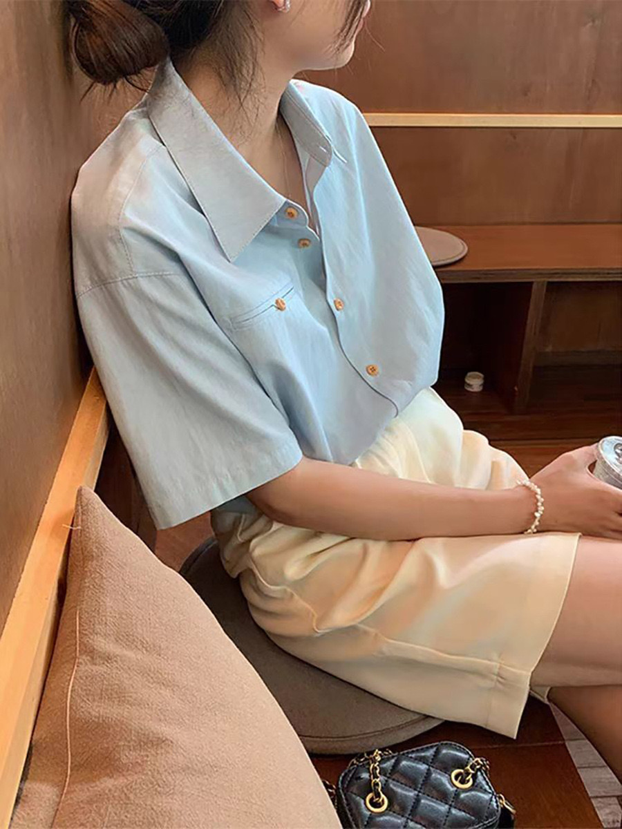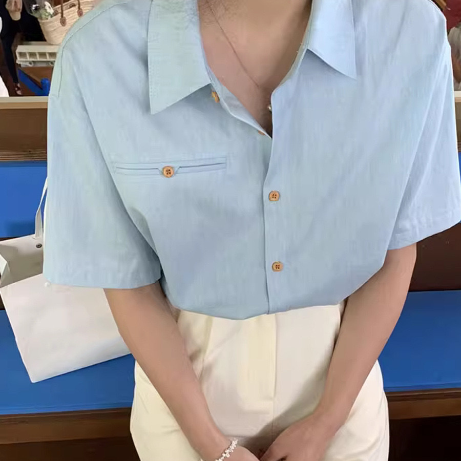 蓝色棉短袖衬衫女夏季宽松衬衣小众设计感翻领上衣ins风