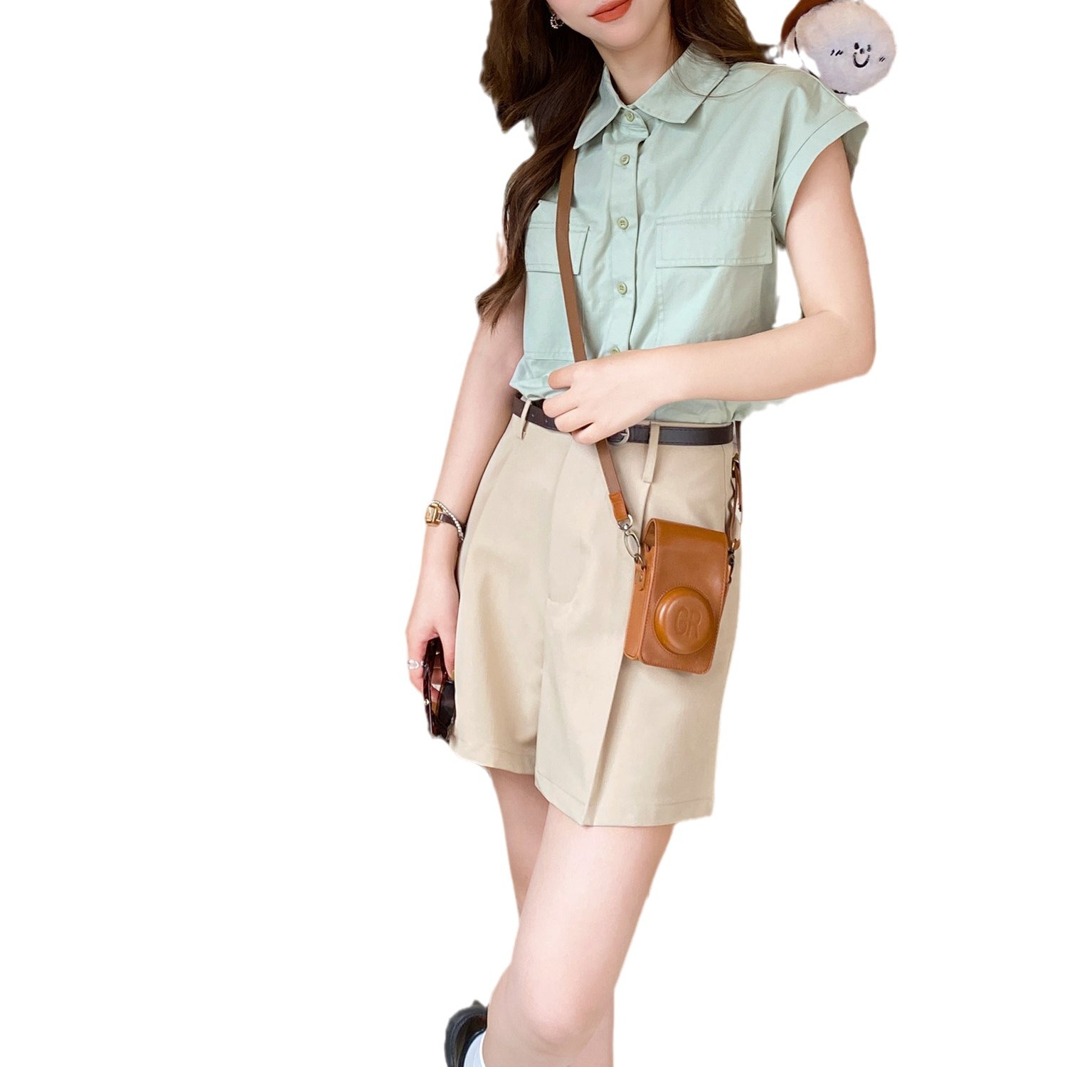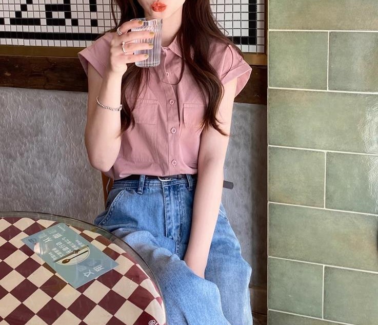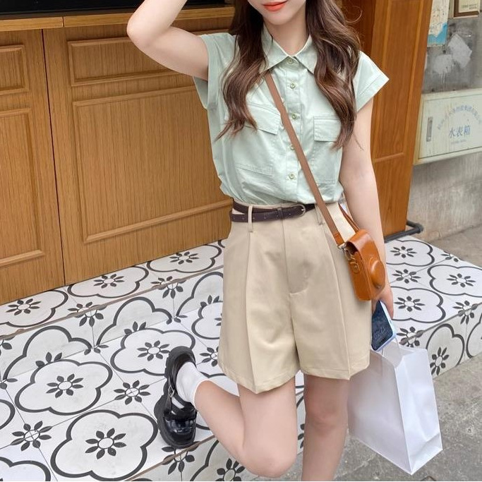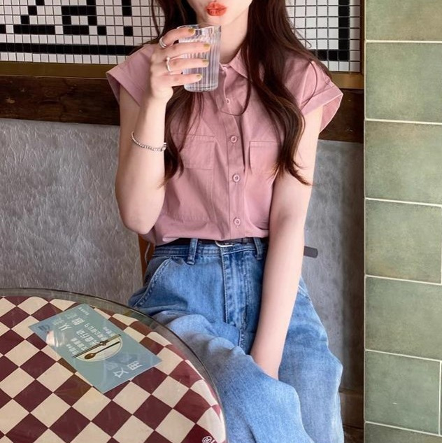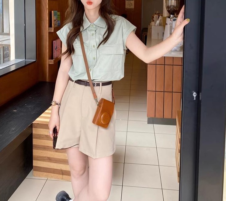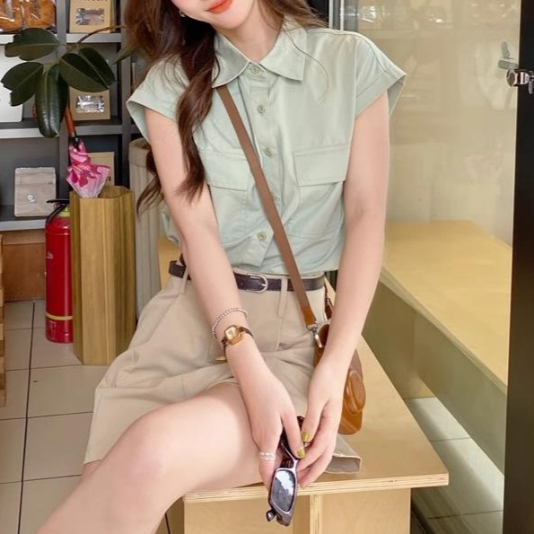 绿色尖领短袖衬衫女夏小众设计气质百搭休闲宽松上衣