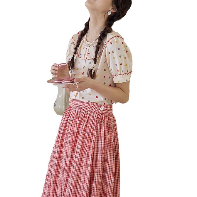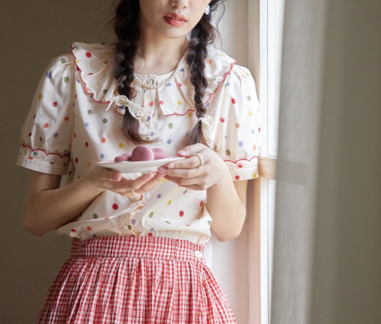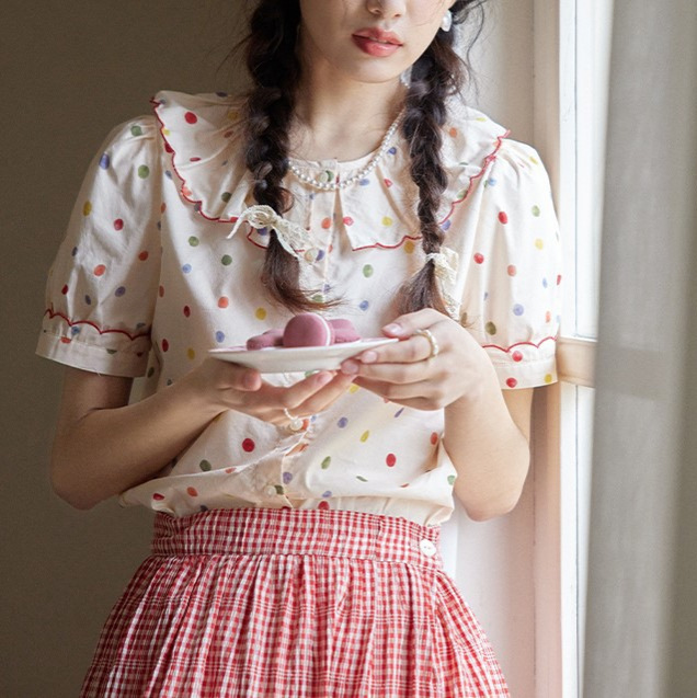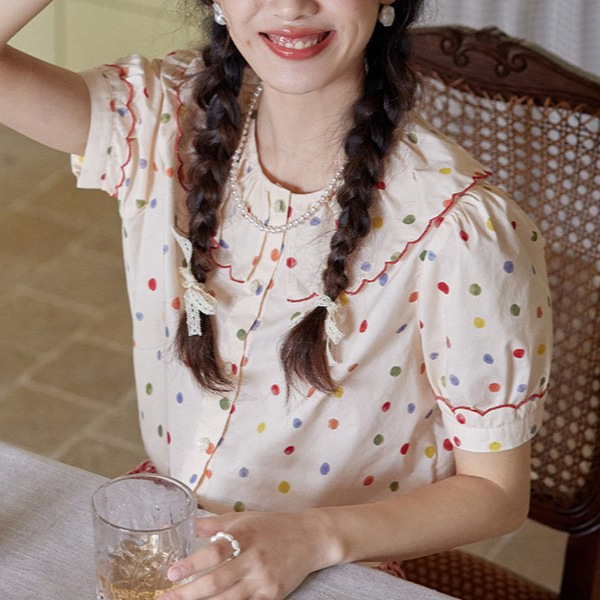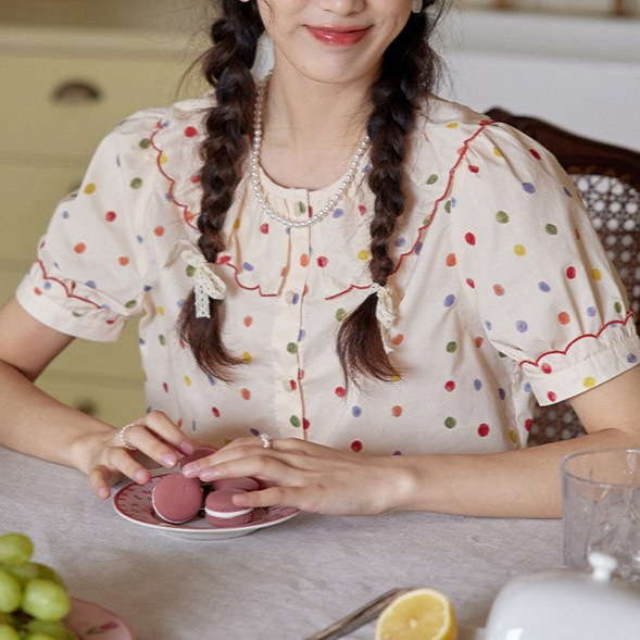 法式甜美少女波点刺绣边翻领衬衫花边领短袖上衣夏新款