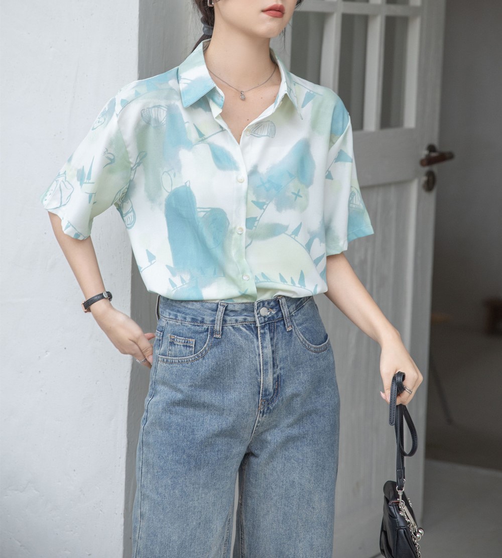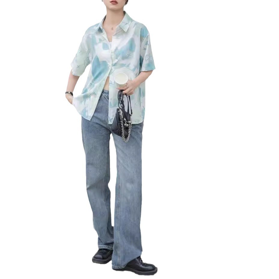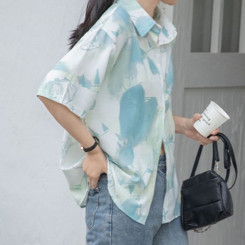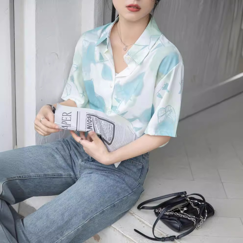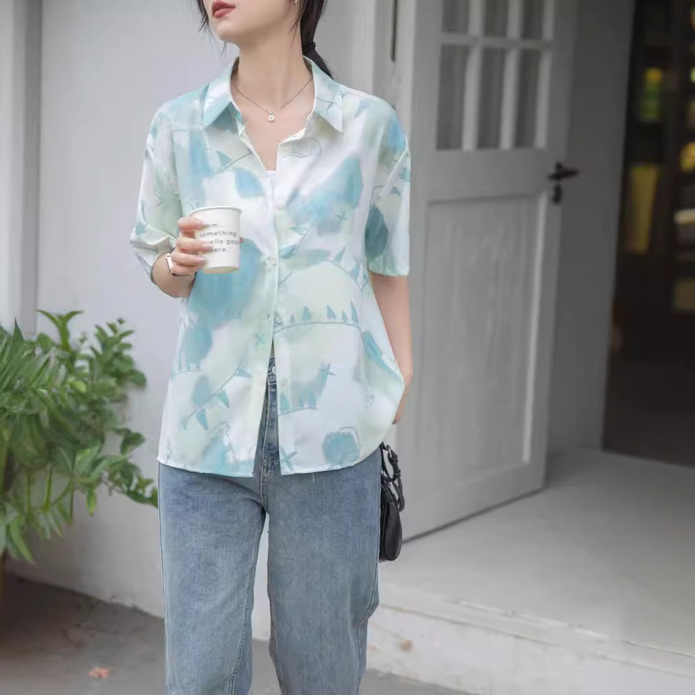 短袖衬衫女2025夏季薄荷绿上衣复古休闲假风休闲印花衬衫