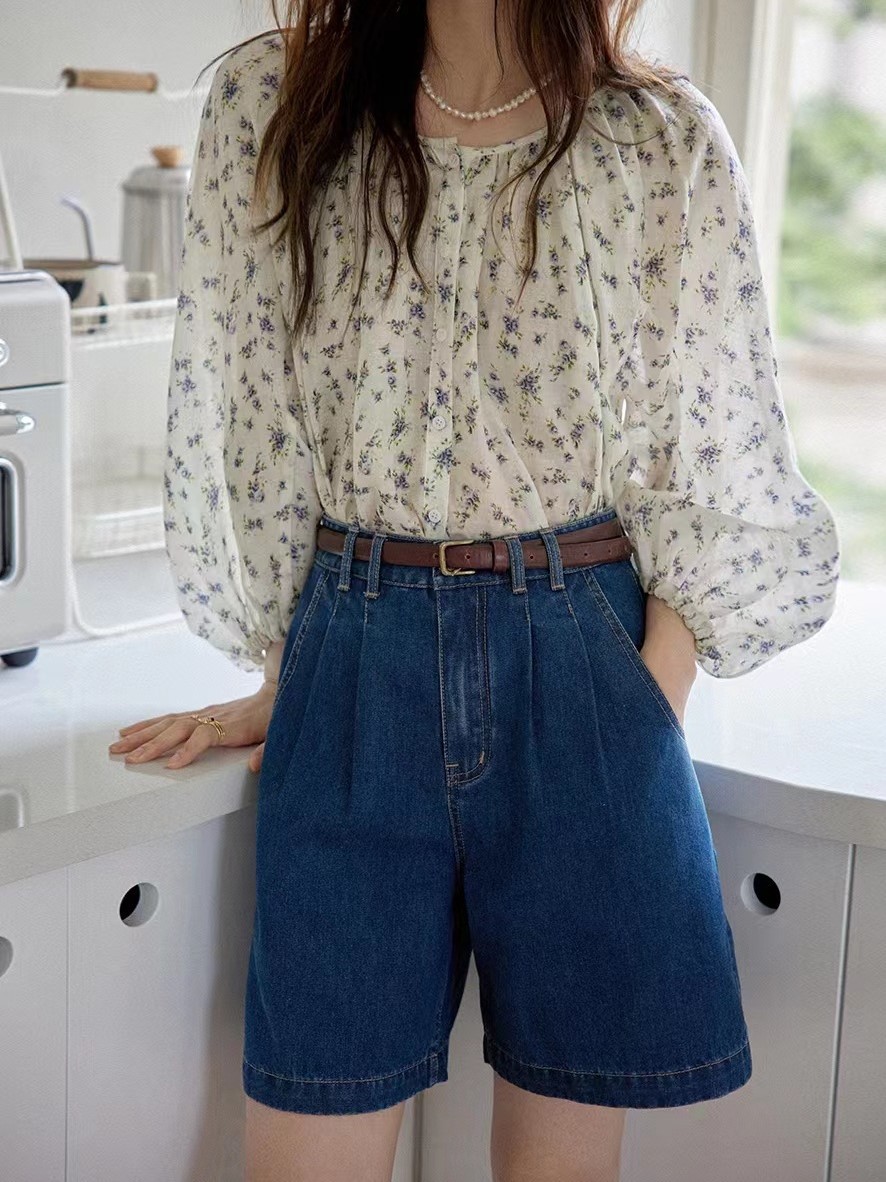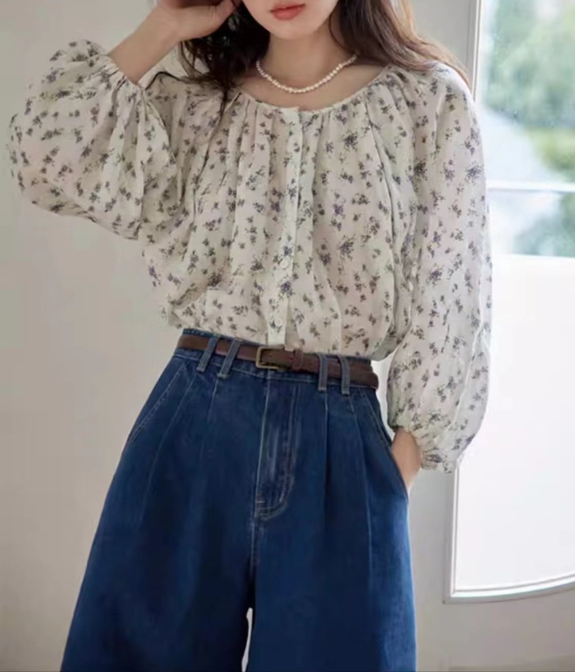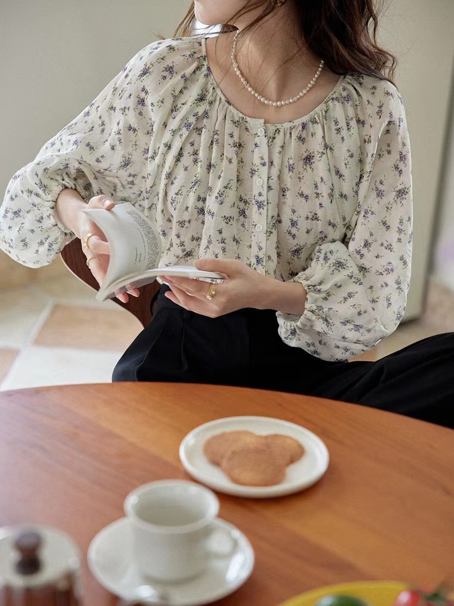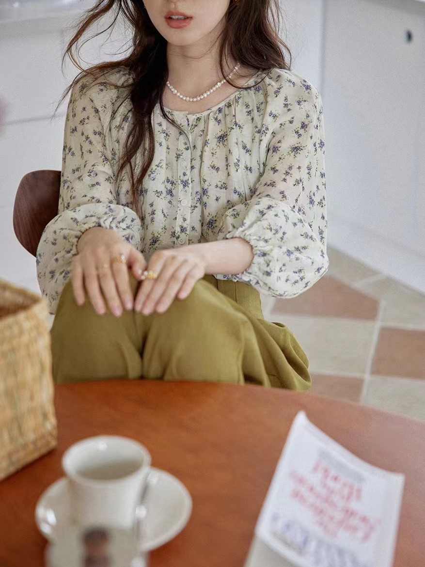 美丽的青柠白茶宽松休闲碎花防晒衬衫女夏薄款小众上衣气质