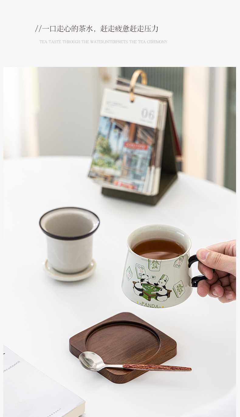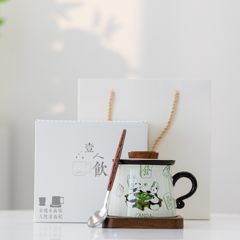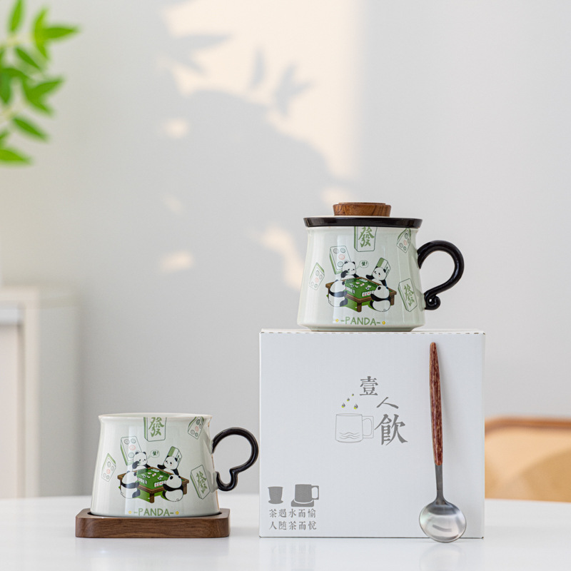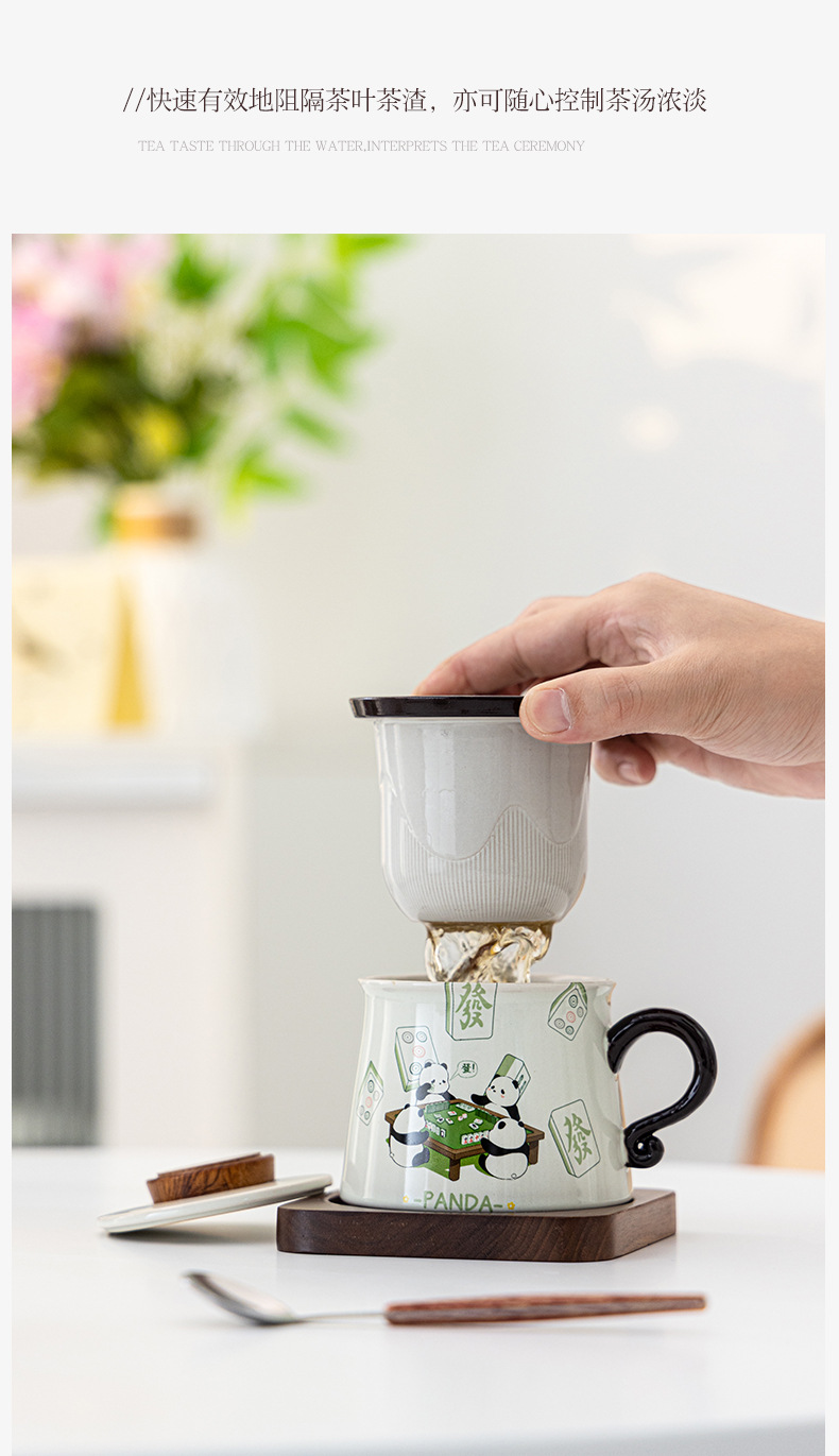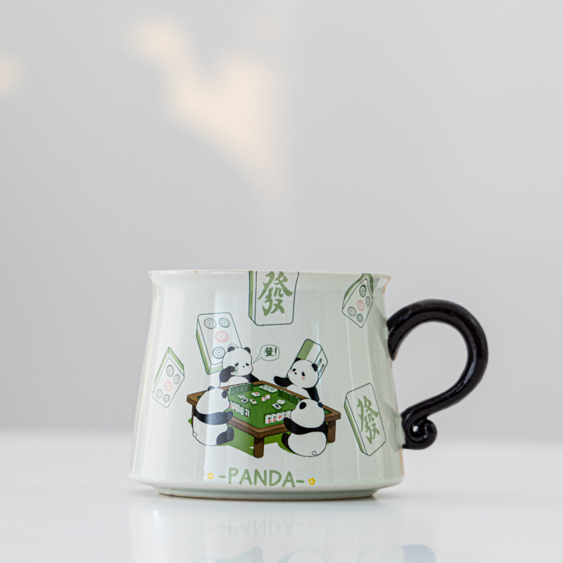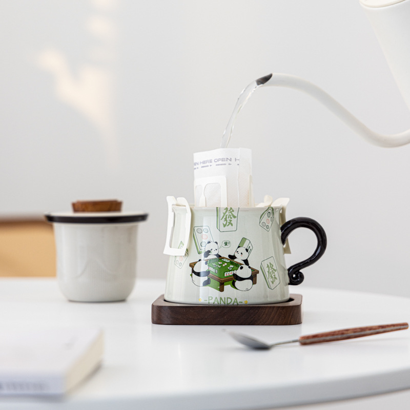 熊猫打麻将草木灰咖啡杯茶水分离陶瓷杯马克杯茶咖杯礼盒装