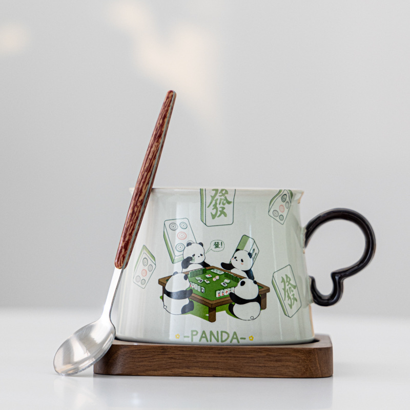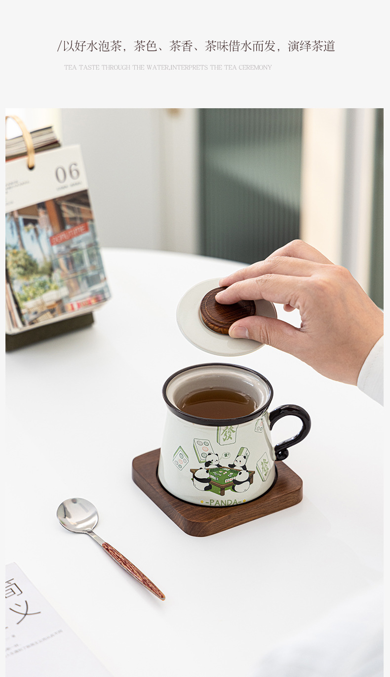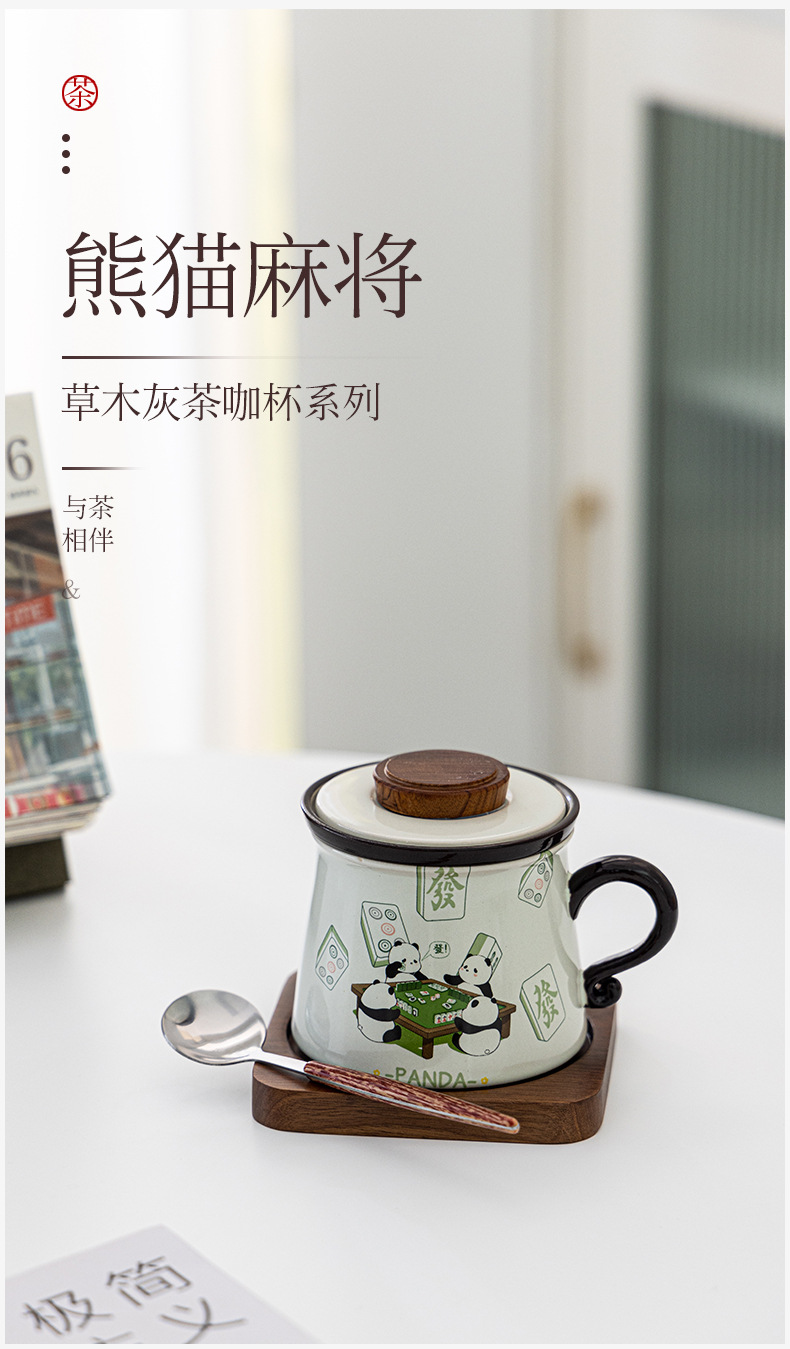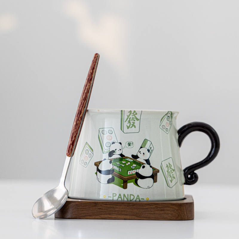 熊猫打麻将草木灰水杯款A+胡桃木杯垫+勺子