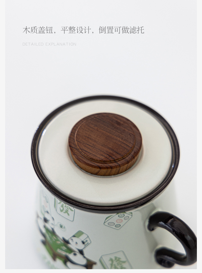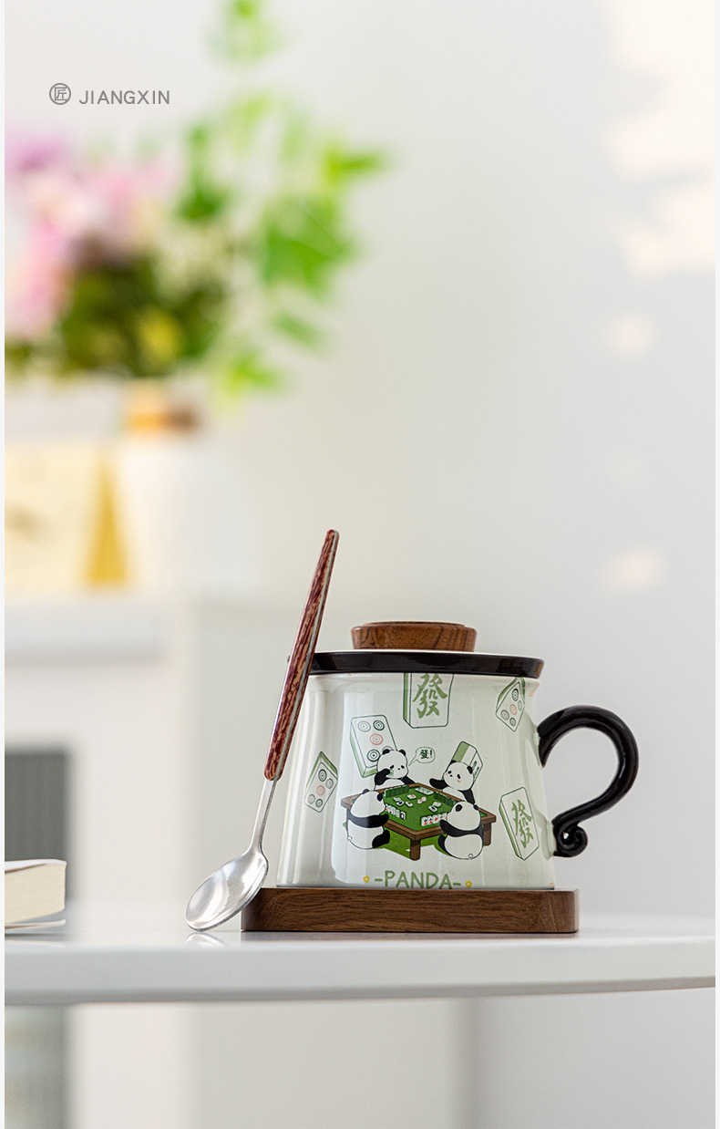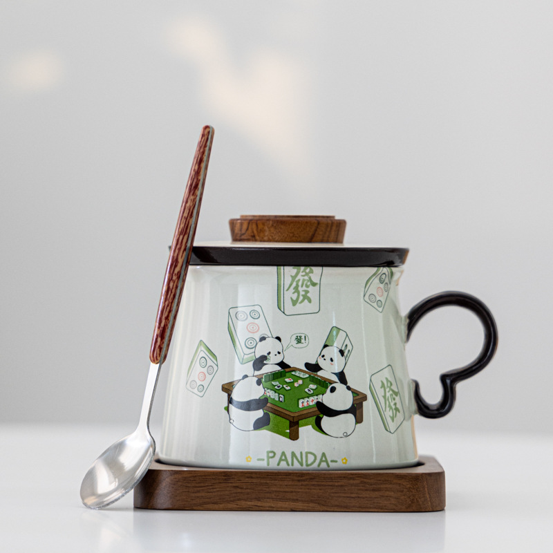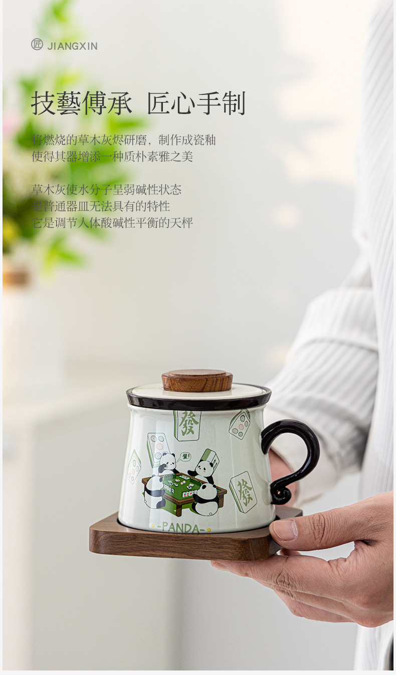 熊猫打麻将草木灰水杯款A+胡桃木杯垫+勺子