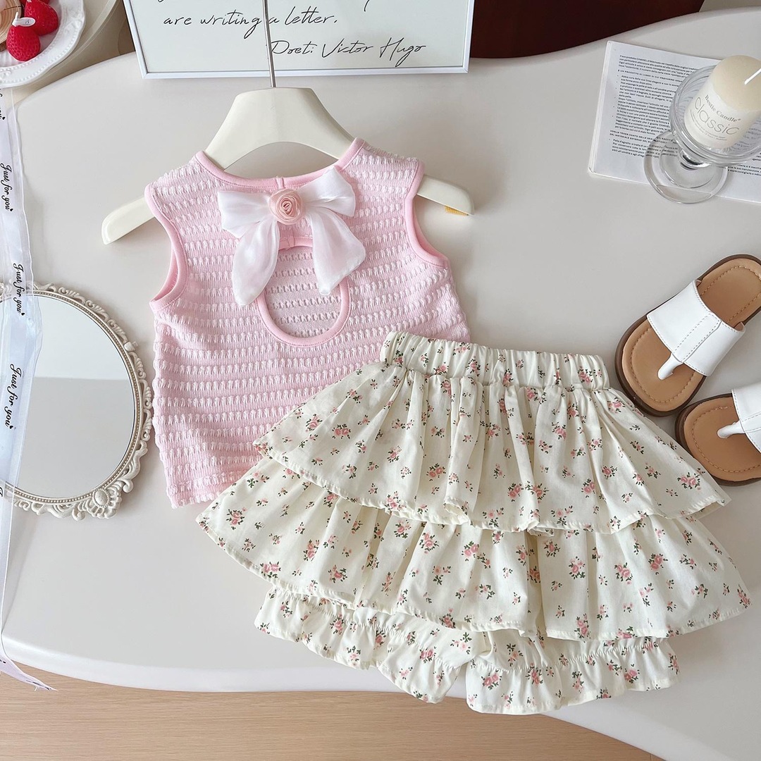 女童夏季套装2025新款女宝洋气蝴蝶结背心时尚碎花裙裤休闲两件套