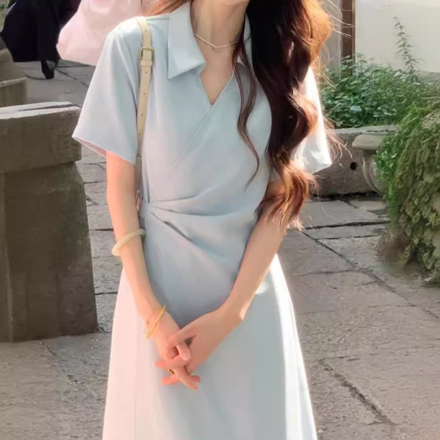 【蓝色大海】夏季简约设计感小众翻领褶皱舒适气质显瘦连衣裙