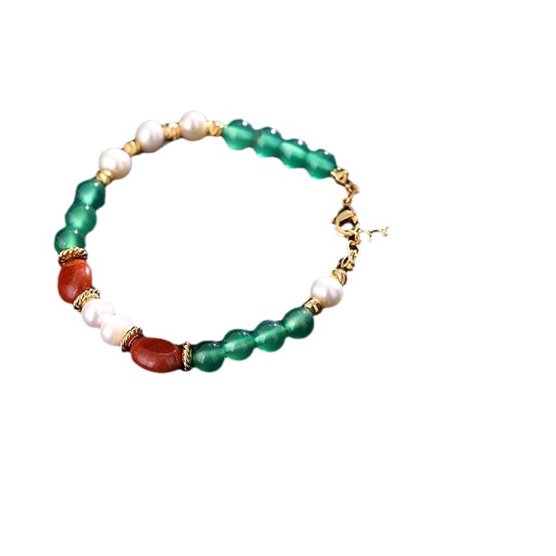 高版本真金电镀 新中式复古祖母绿玛瑙天然珍珠手环女南红石手链