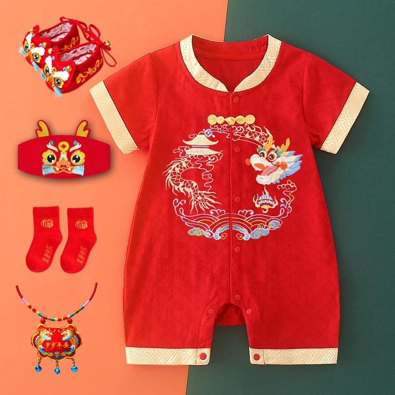 百天连体衣夏季唐装男童婴儿满月服短袖抓周服国风礼服