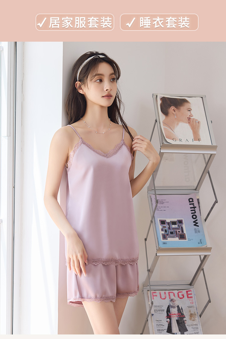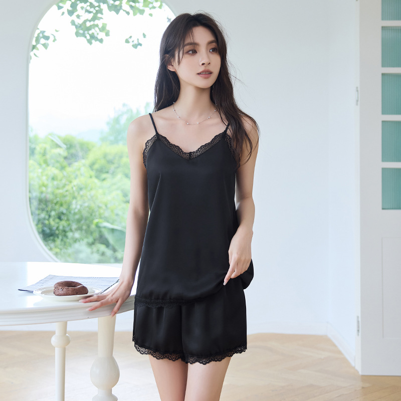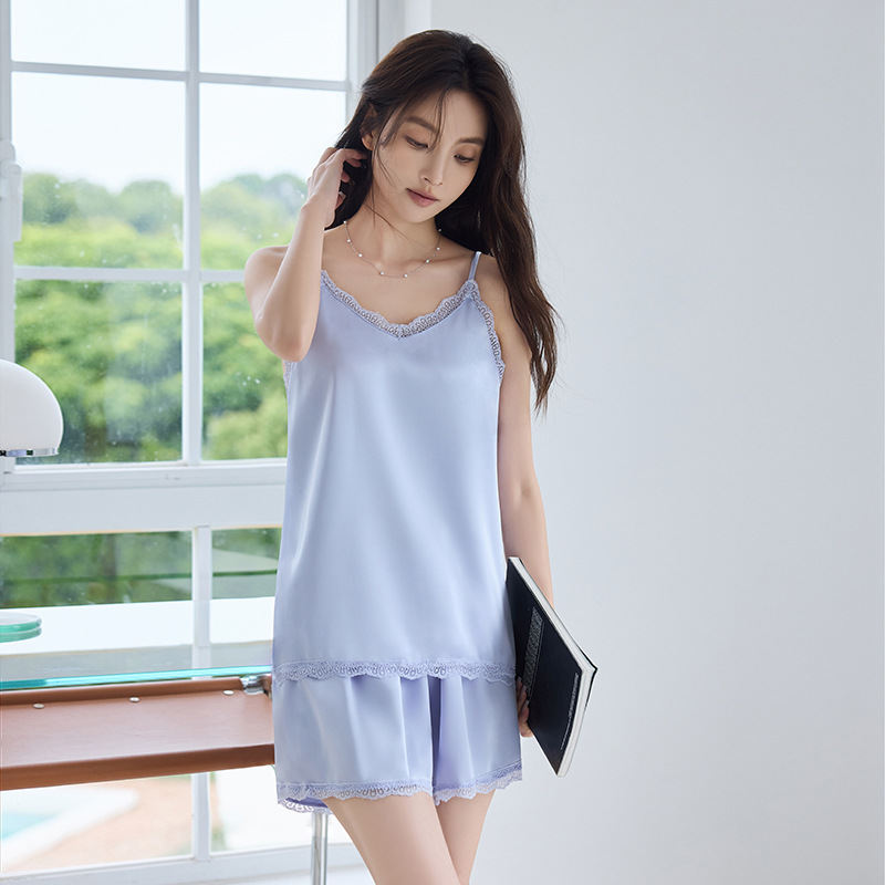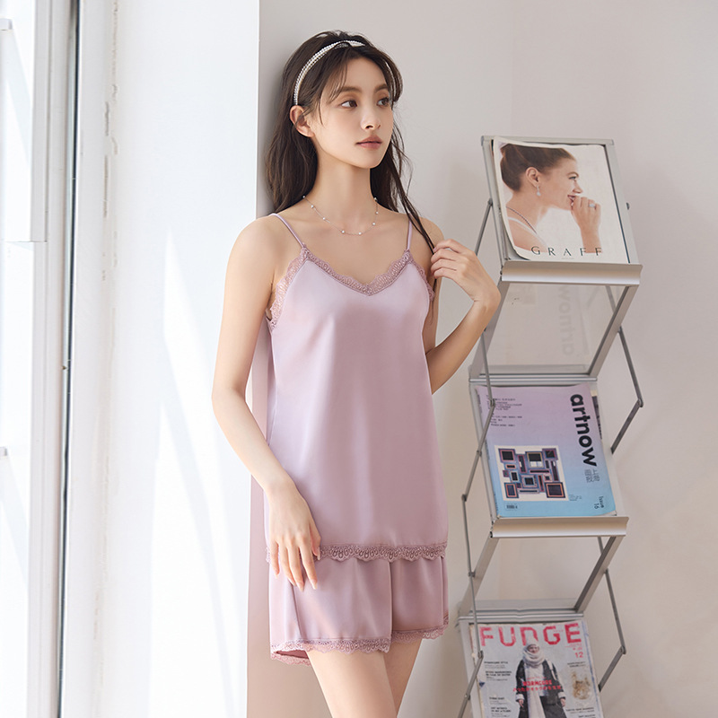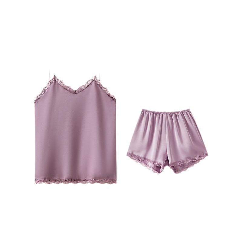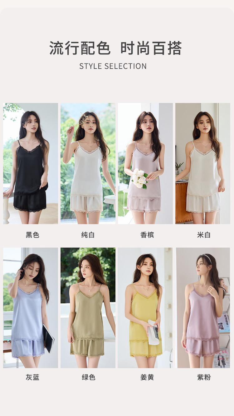 冰丝睡衣套装女宽松夏季薄款吊带背心短裤两件套仿真丝缎面家居服