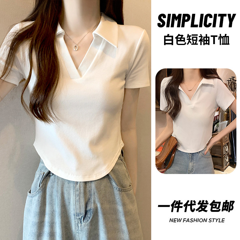 小个子正肩立领polo衫夏季显瘦新款高弹螺纹面料白色短袖t恤女