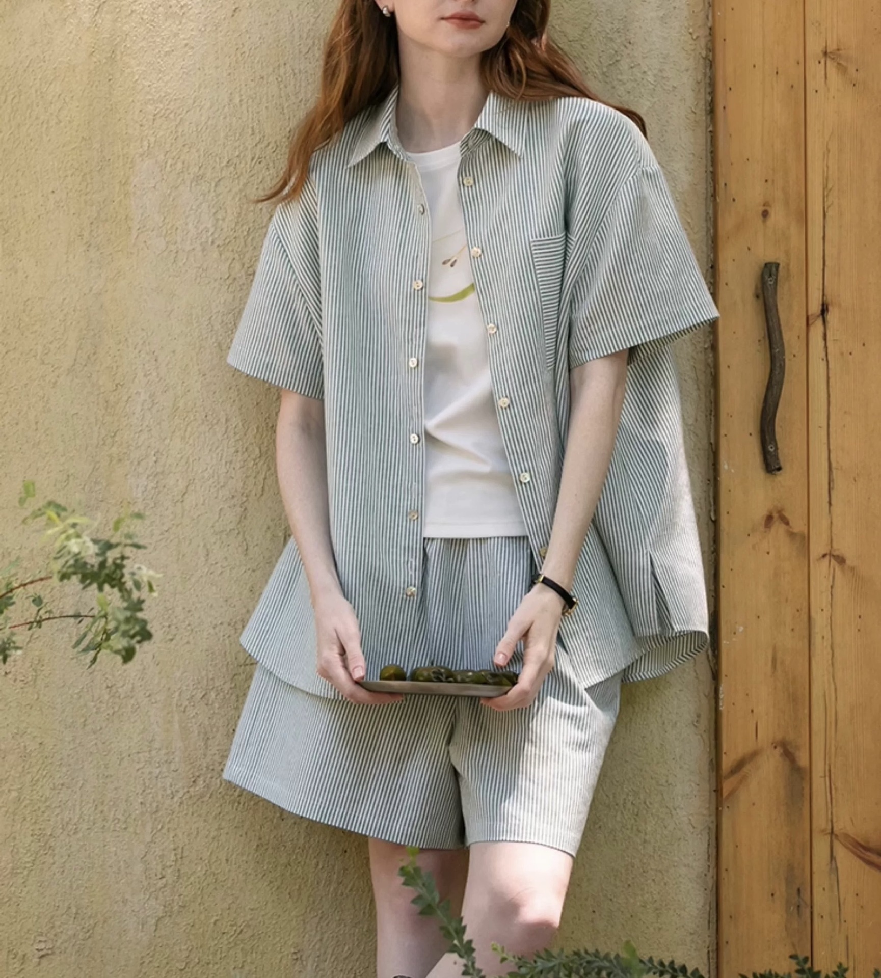 MELLIY春夏季新款通勤棉麻混纺休闲条纹衬衫短裤两件套套装