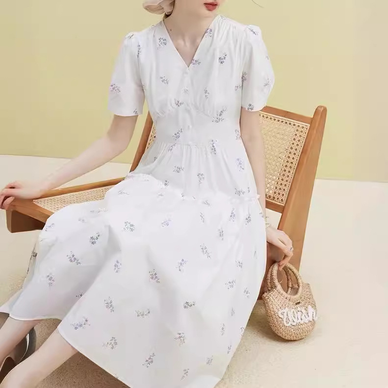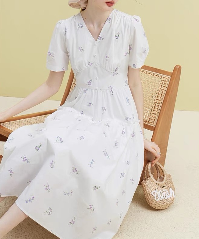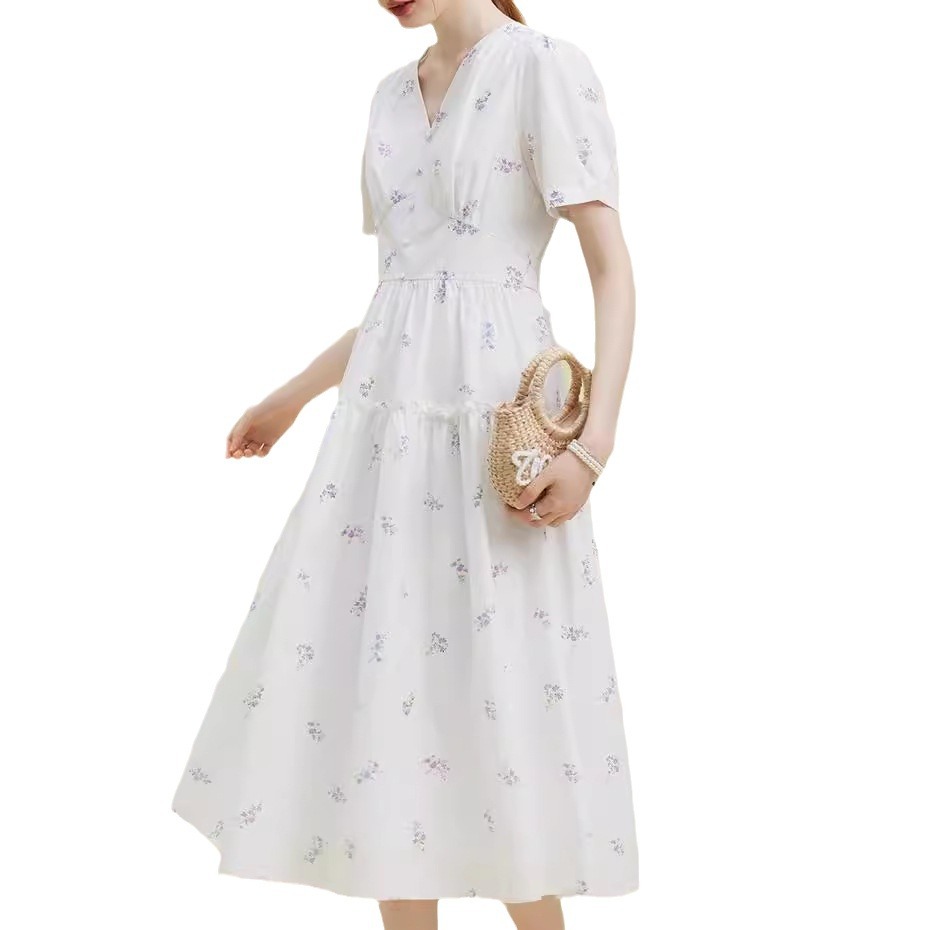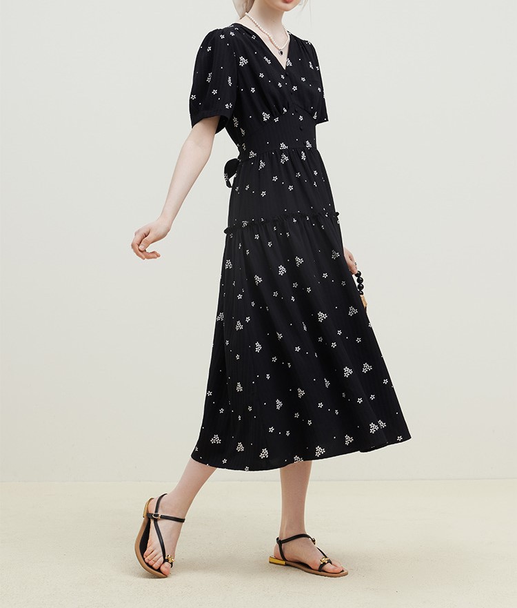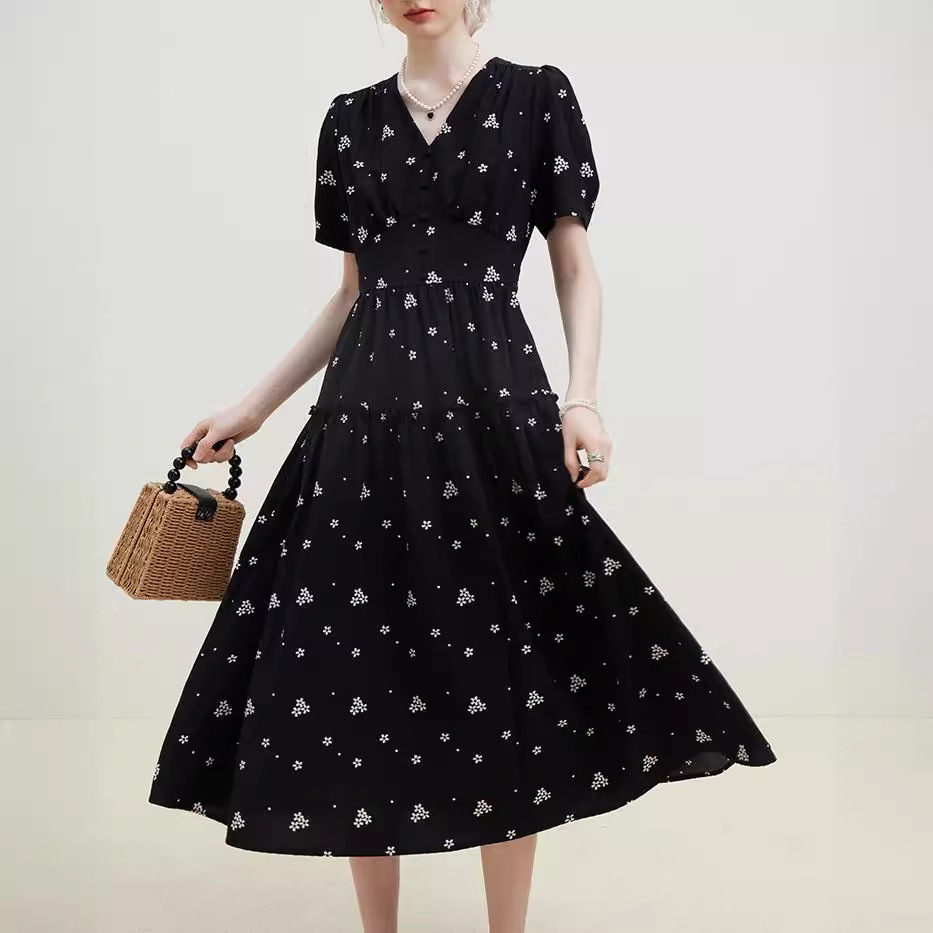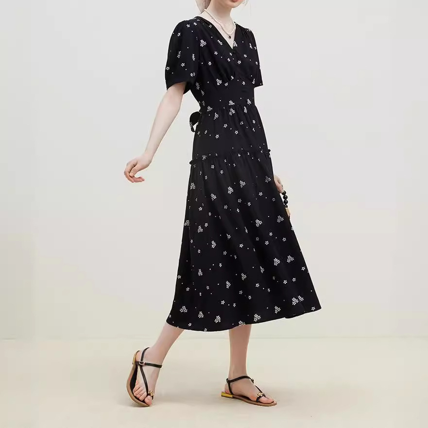 范思蓝恩 茶歇法式黑色碎花连衣裙女夏季气质收腰显瘦V领长裙