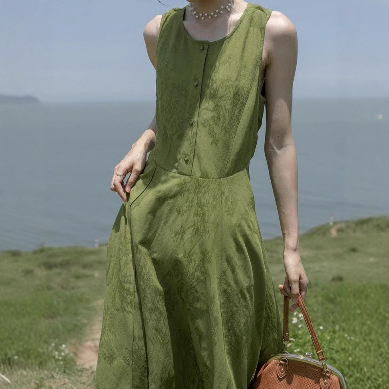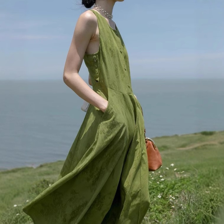solihgter背心吊带连衣裙气质女无袖短袖绿色显瘦露锁骨美背长裙