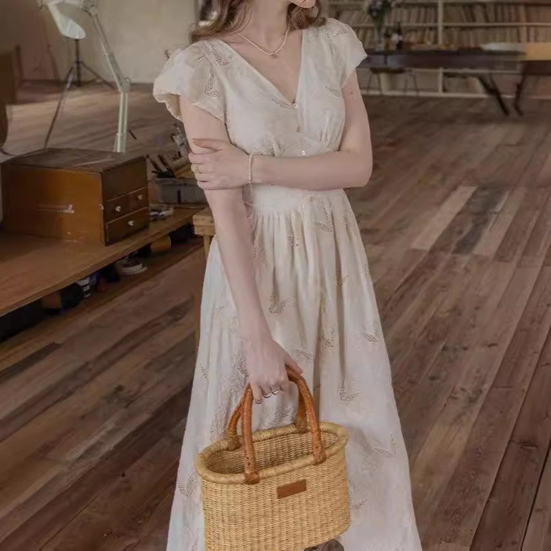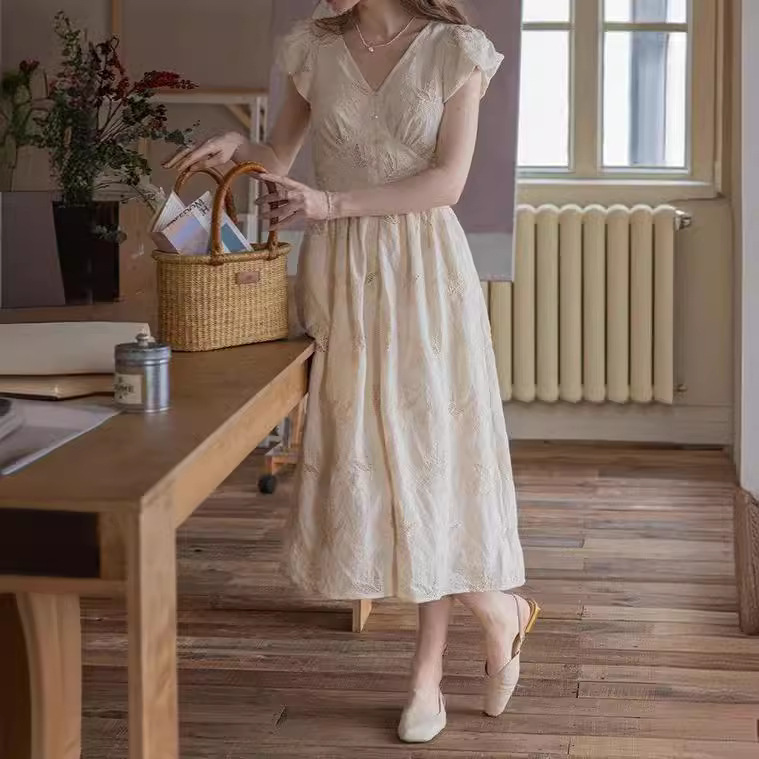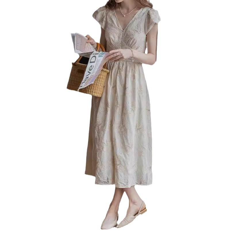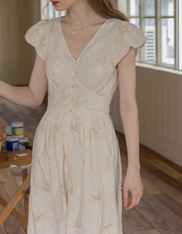 Dailyrat 棉质 双股线盘带重工刺绣工艺 /法式v领连衣裙女夏季