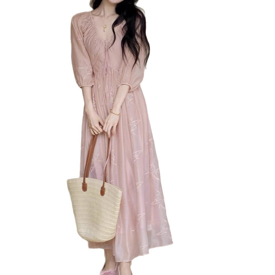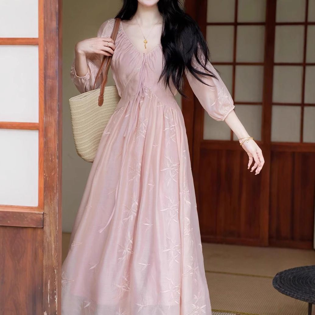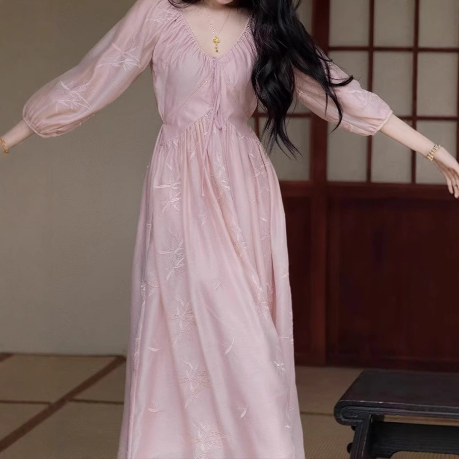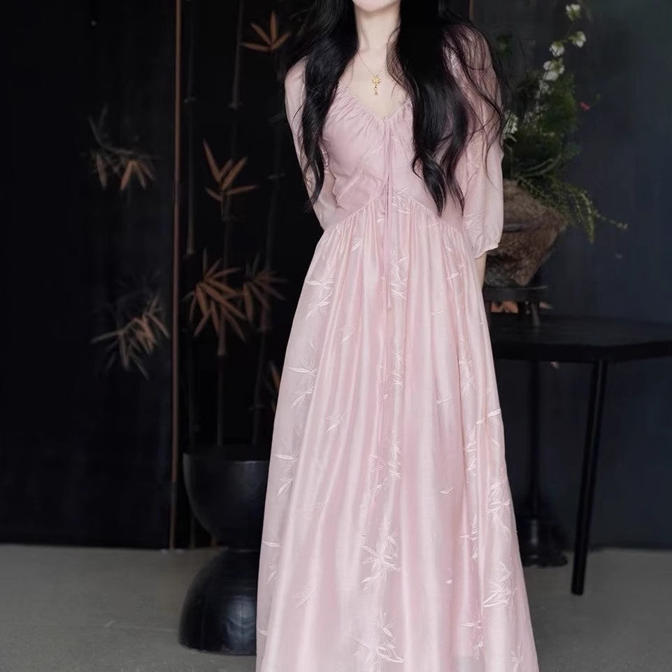 TYNAG【竹意】国风新中式收腰粉色v领刺绣连衣裙女夏新款