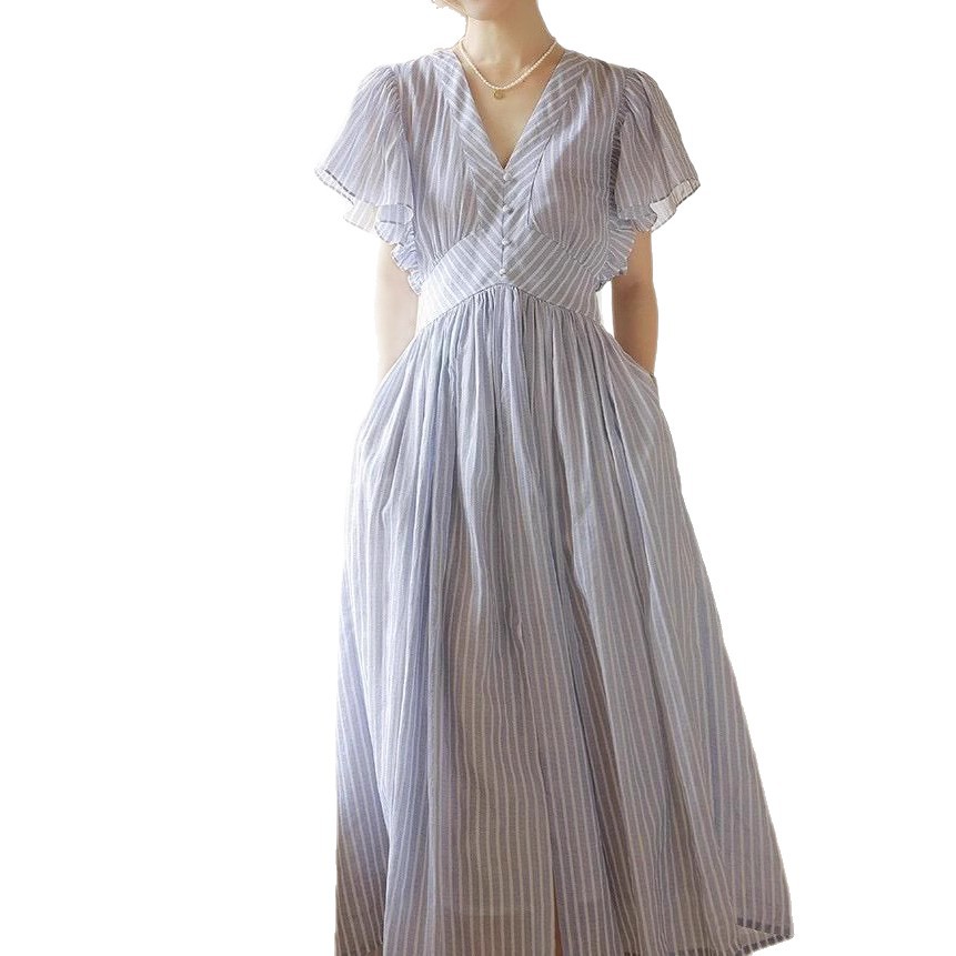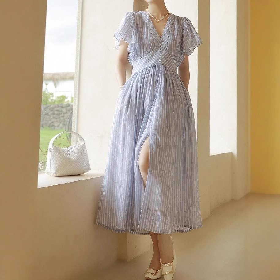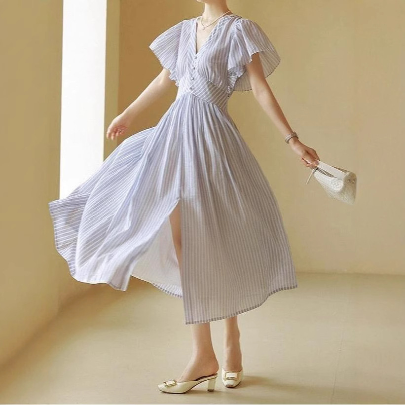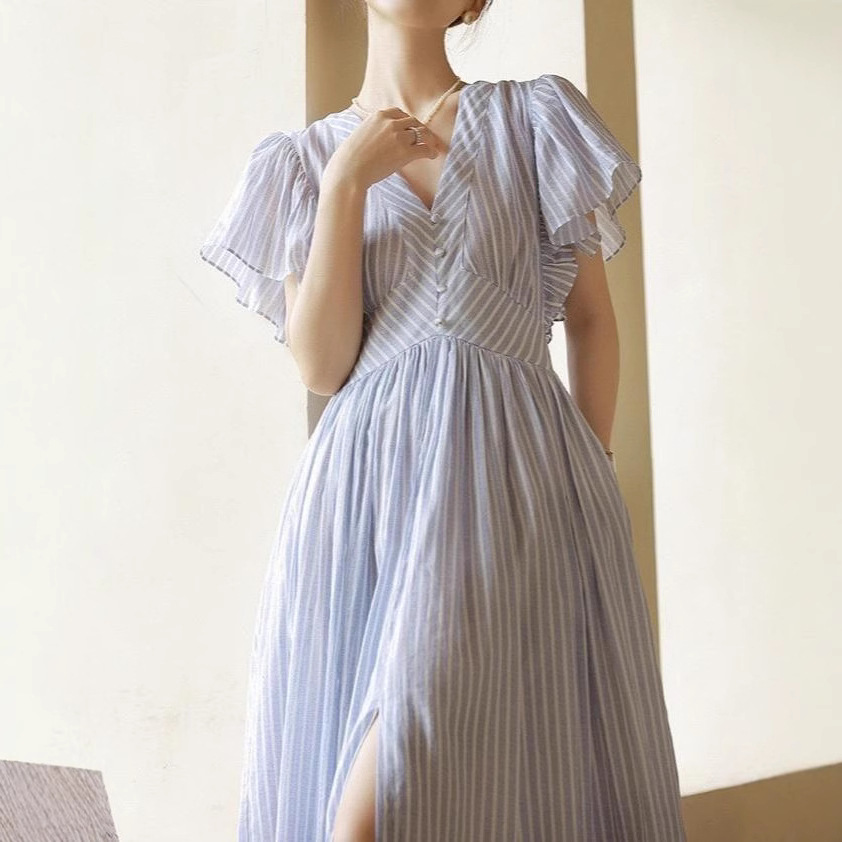 进口苎麻数码直喷!法式夏女新款高档裁剪显瘦气质V领大摆连衣裙