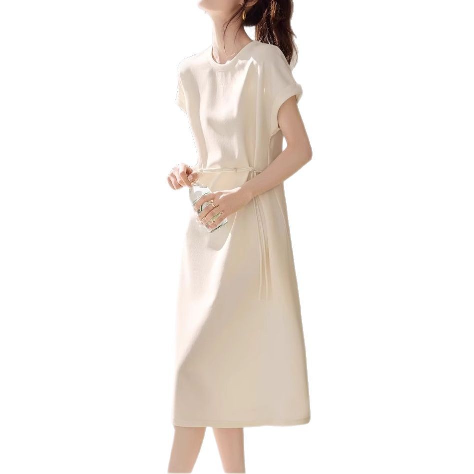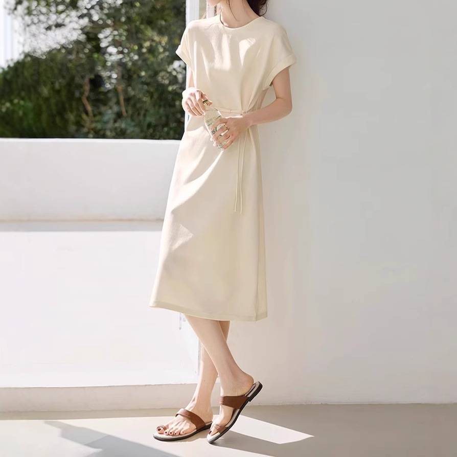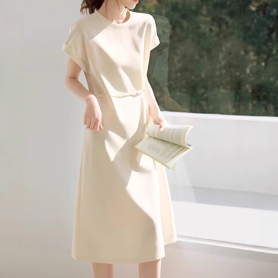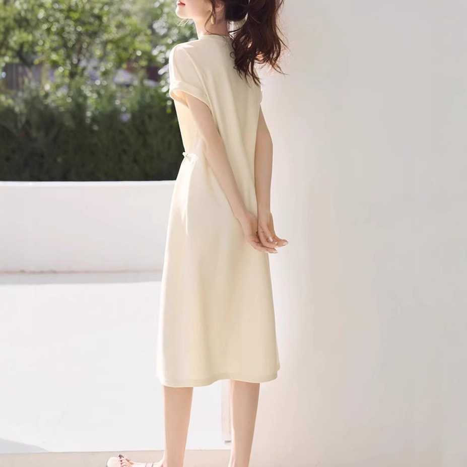 轻国风休闲感纯色连衣裙2025夏季新款百搭显瘦短袖连衣裙