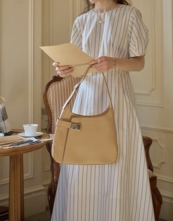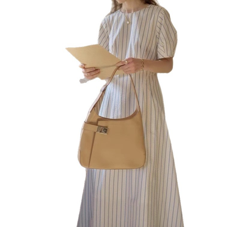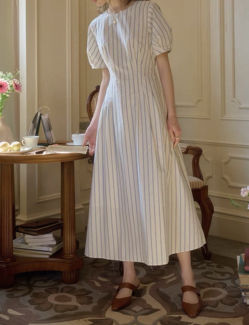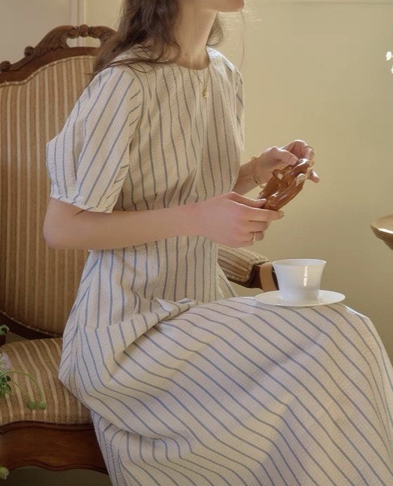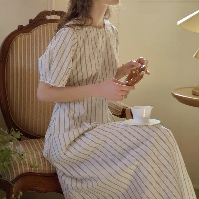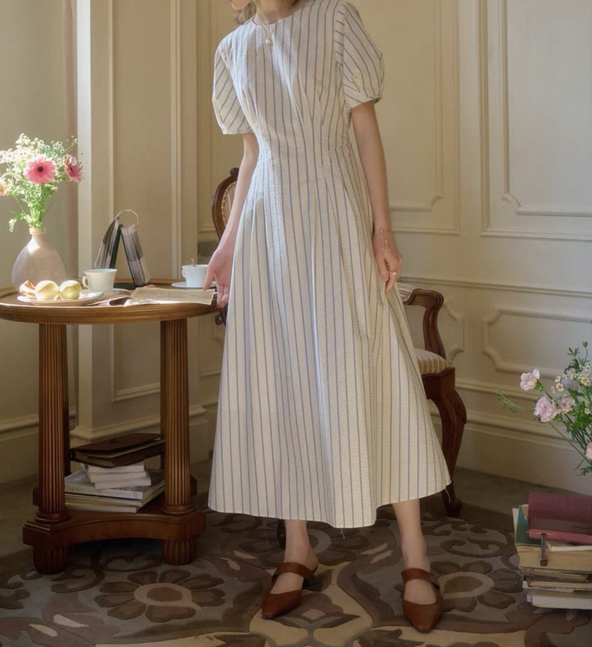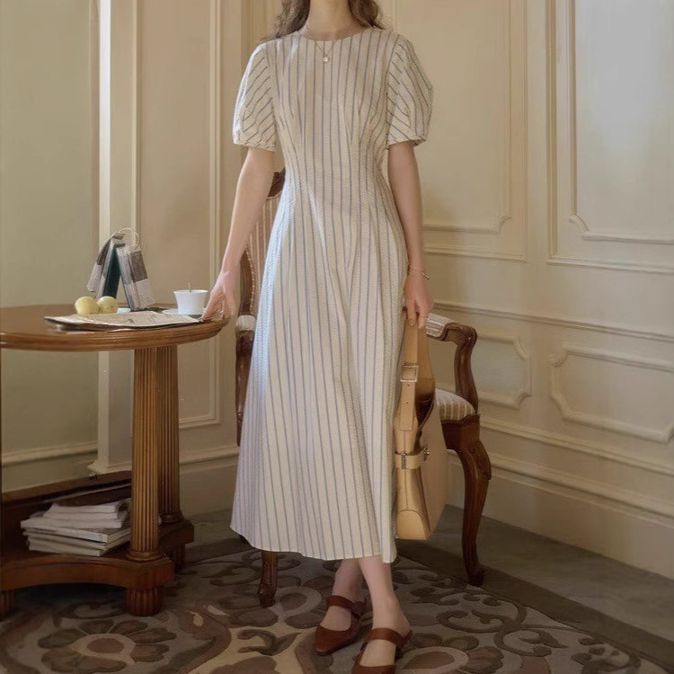 品质推荐 城市日记 高级感条纹连衣裙女夏法式泡泡袖收腰a字裙子