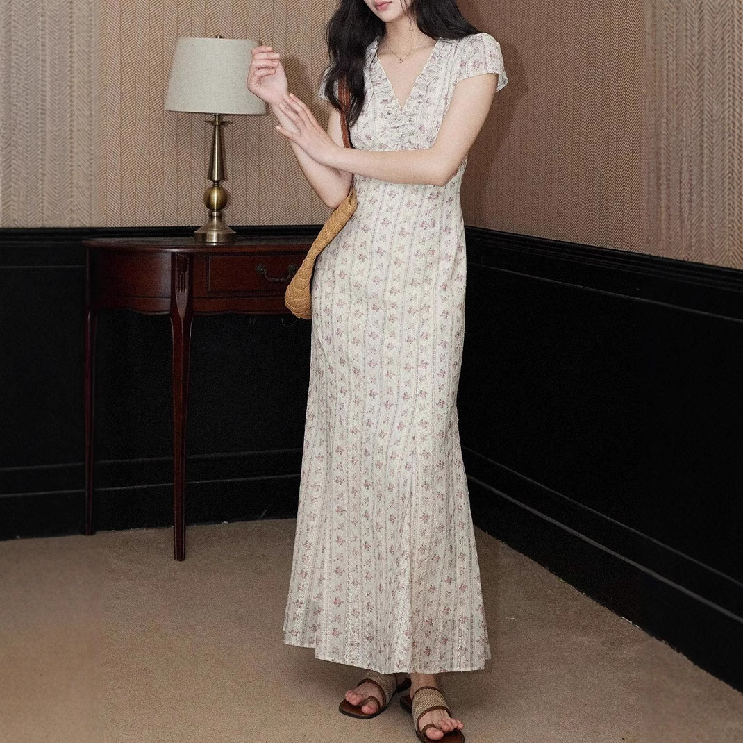 贰羊设计【乐之】复古v领刺绣碎花连衣裙女气质高级修身法式长裙