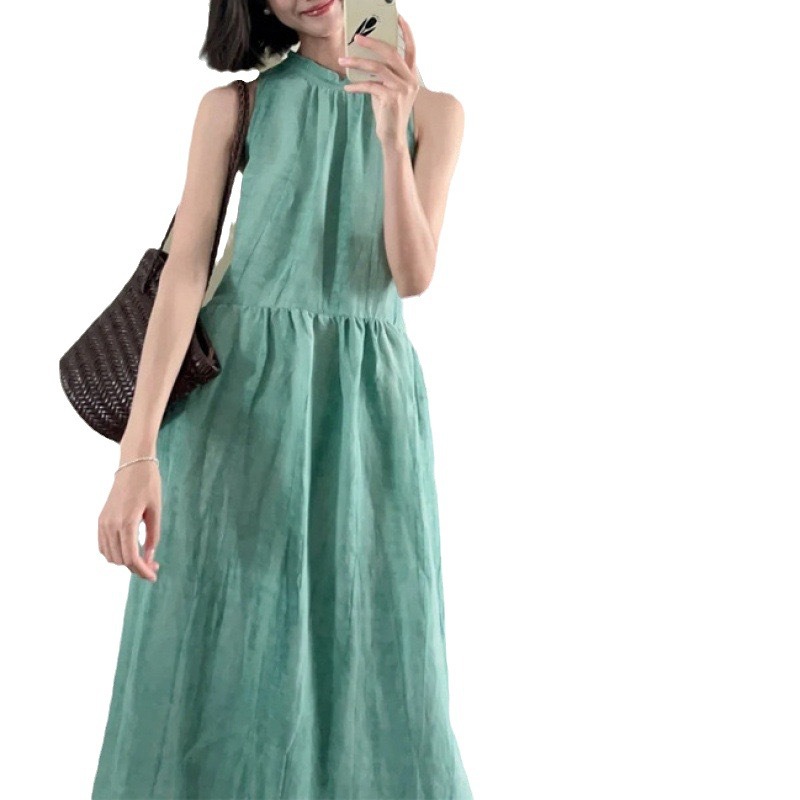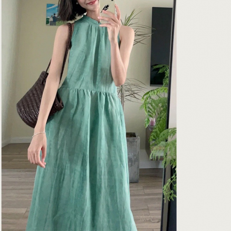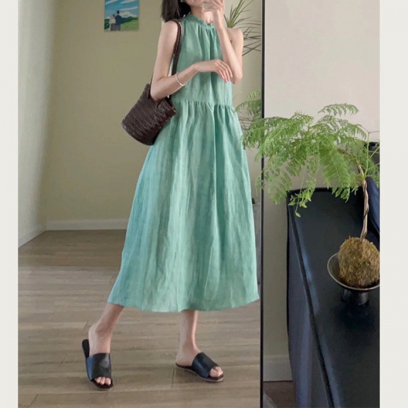 Botaniquo植物雪“波西塔诺的夏天”亚麻做皱扎染挂脖连衣裙A字裙