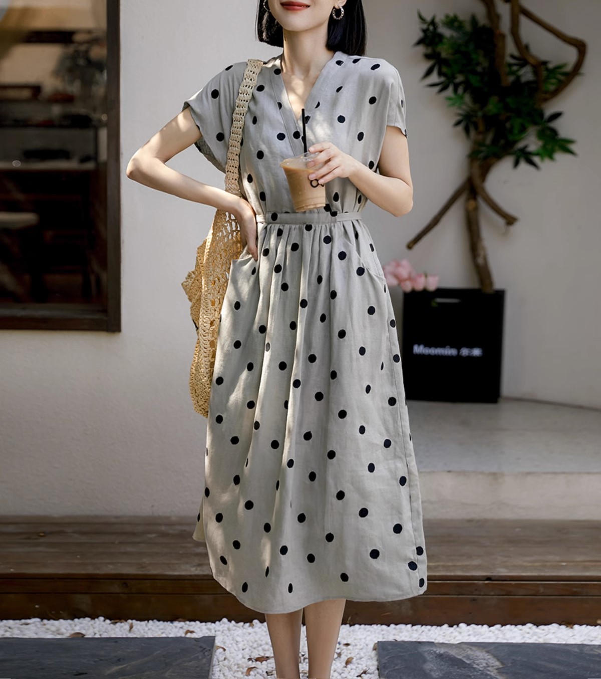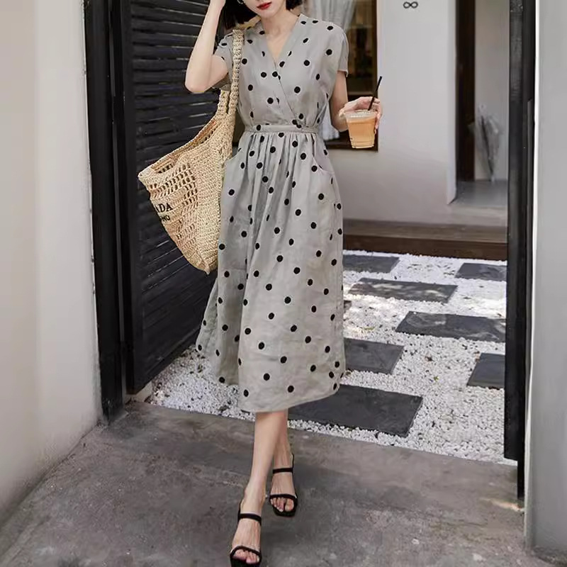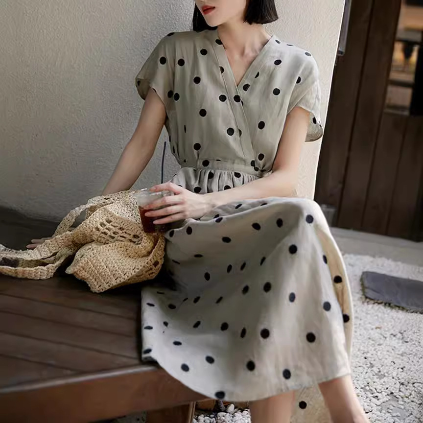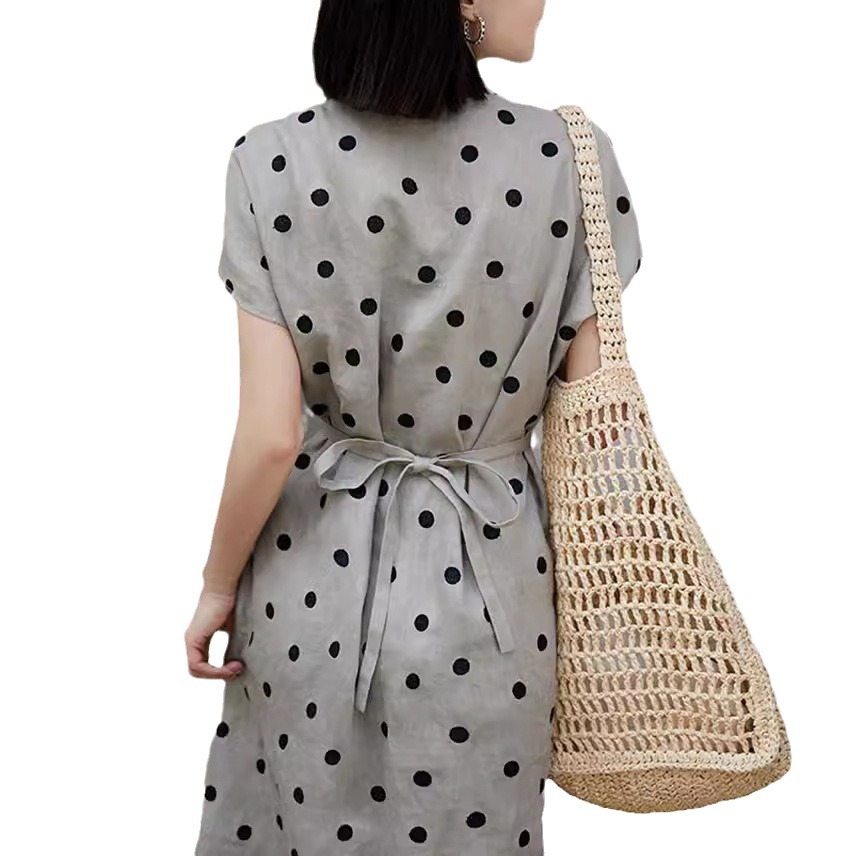 斑驳艺术复古刺绣波点 轻盈感小众设计夏季女高级质感亚麻连衣裙