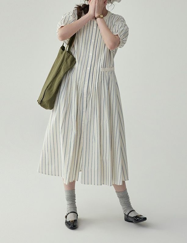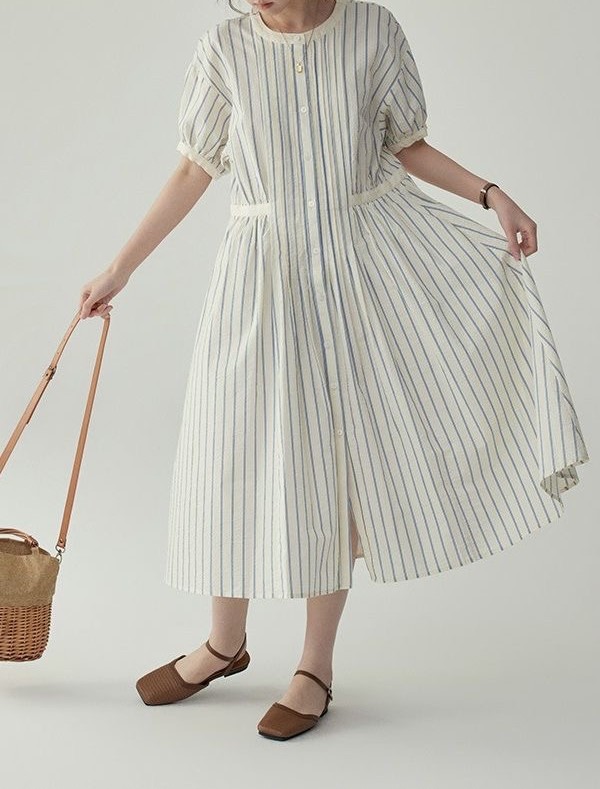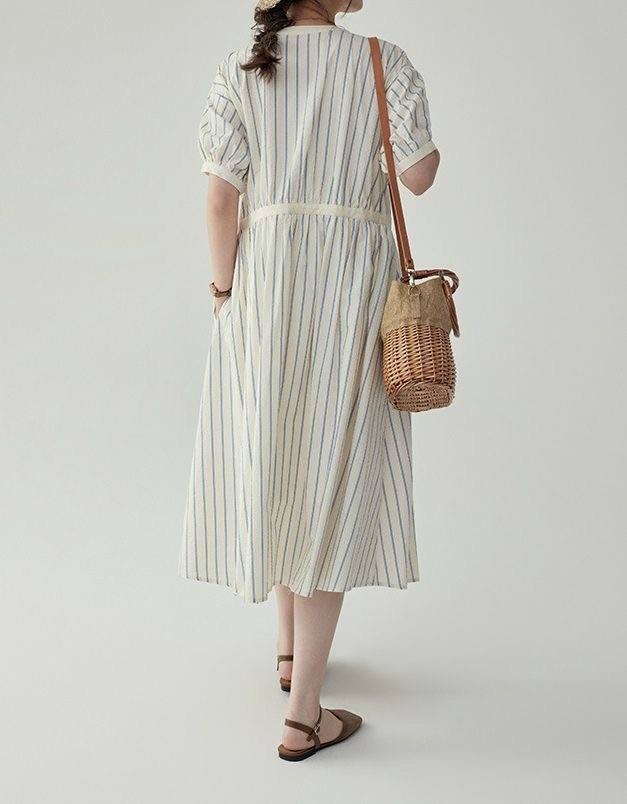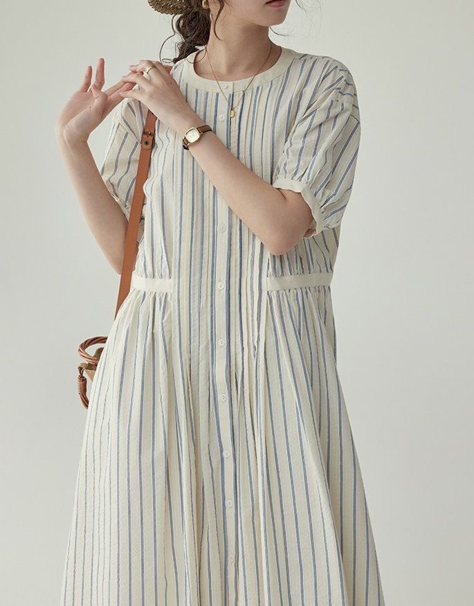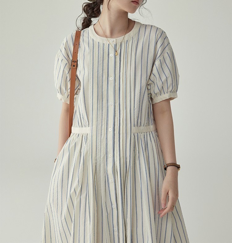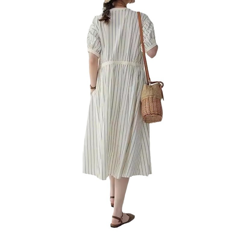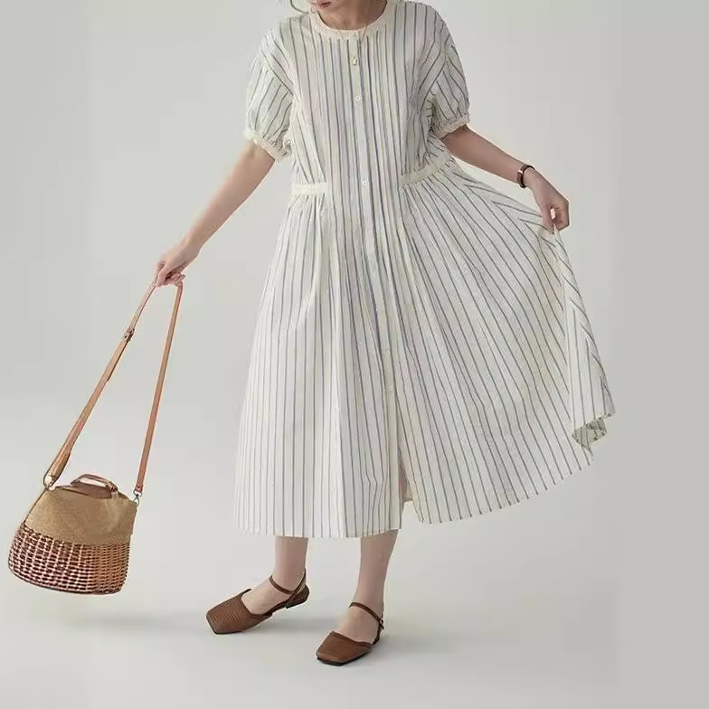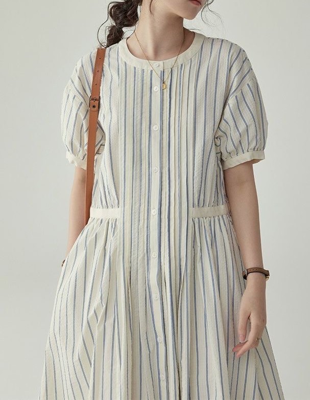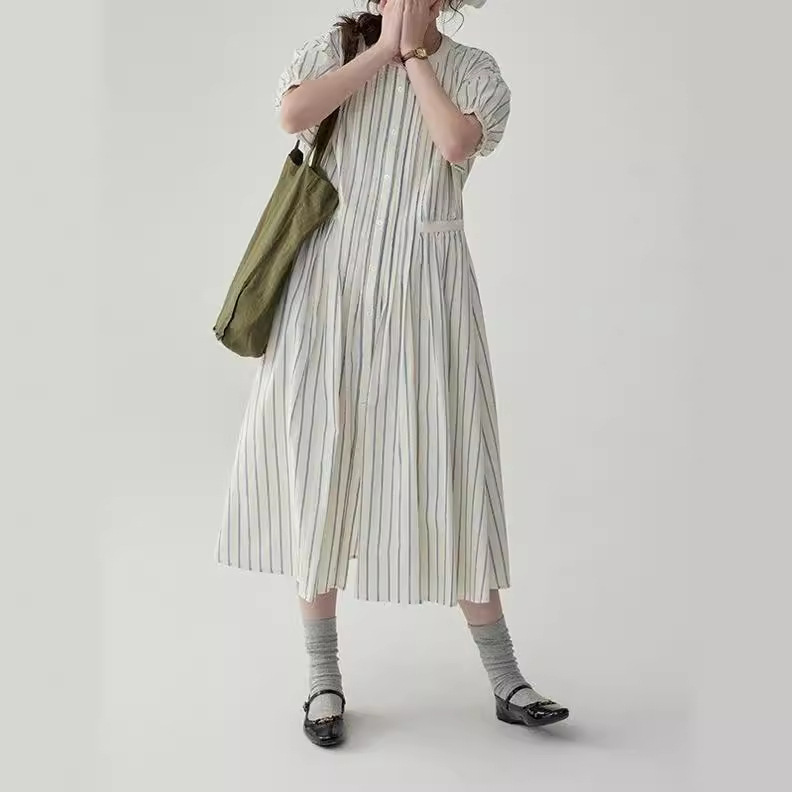 法式圆领条纹泡泡袖连衣裙女夏季裙子收腰高级质感中长款裙子