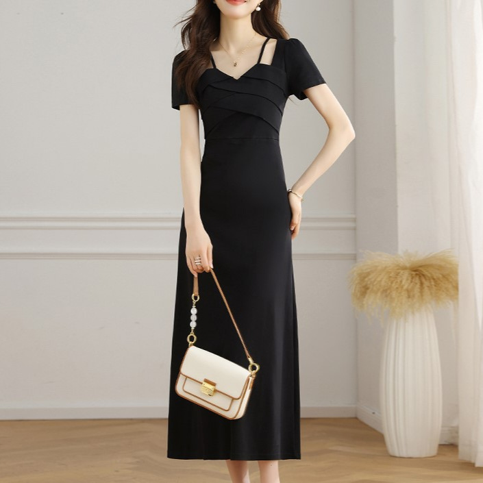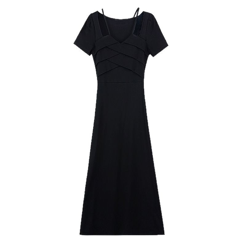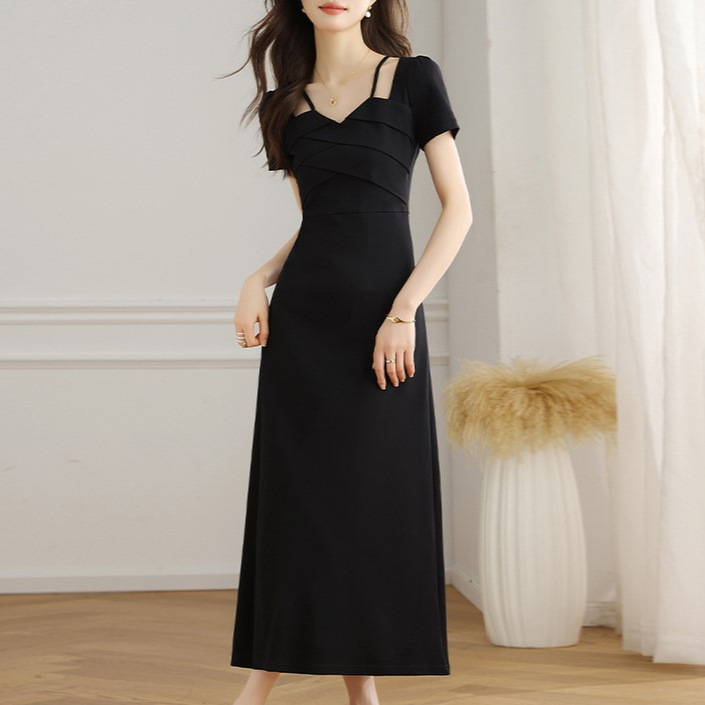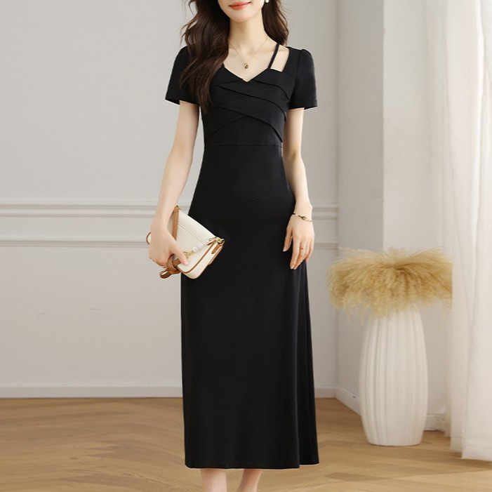 黑色法式挂脖裙子女夏季新款收腰a字裙气质高级长款短袖连衣裙