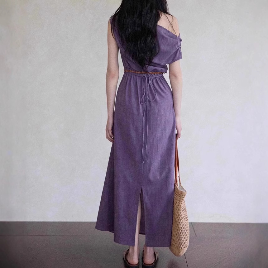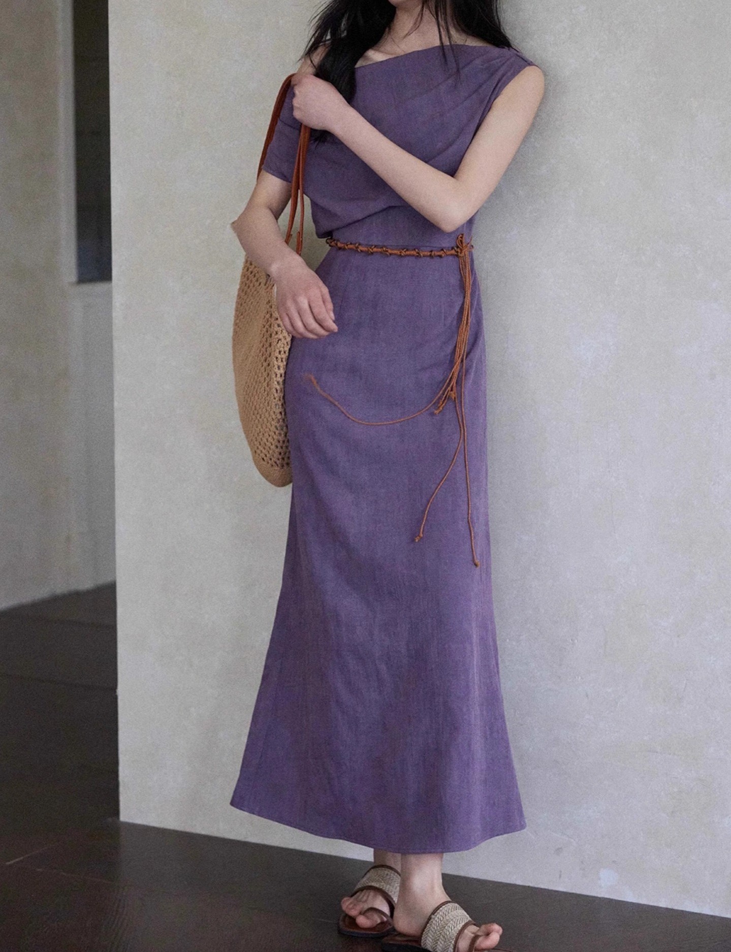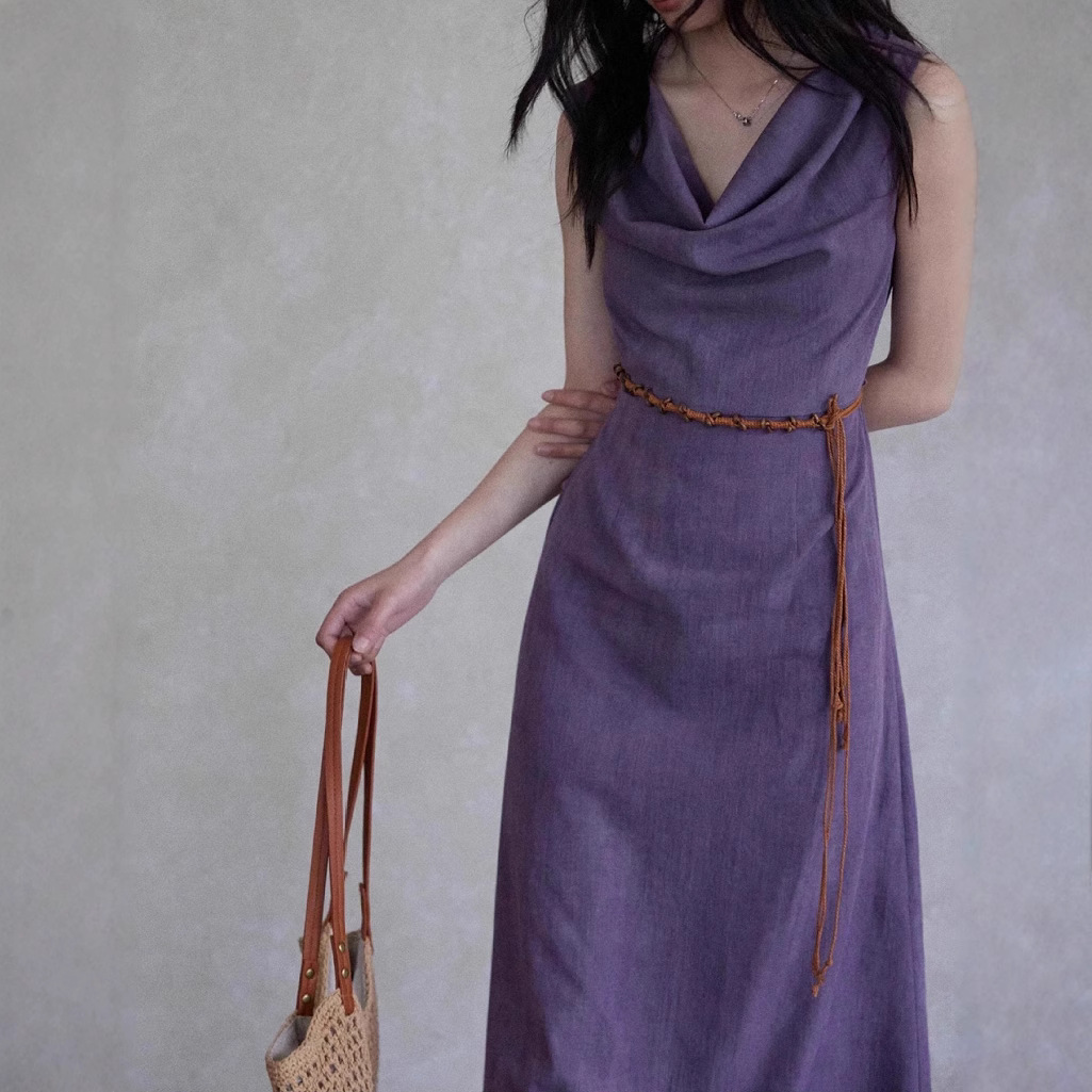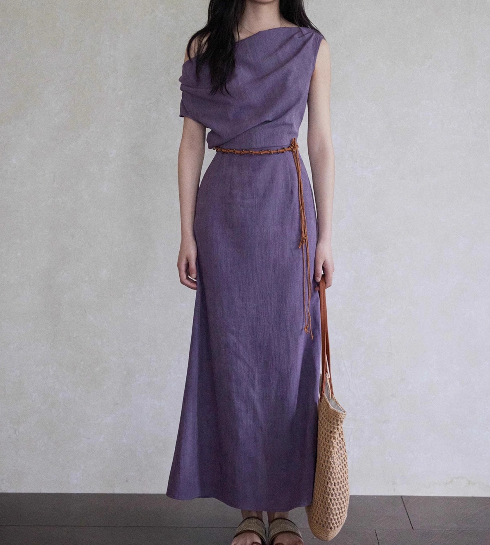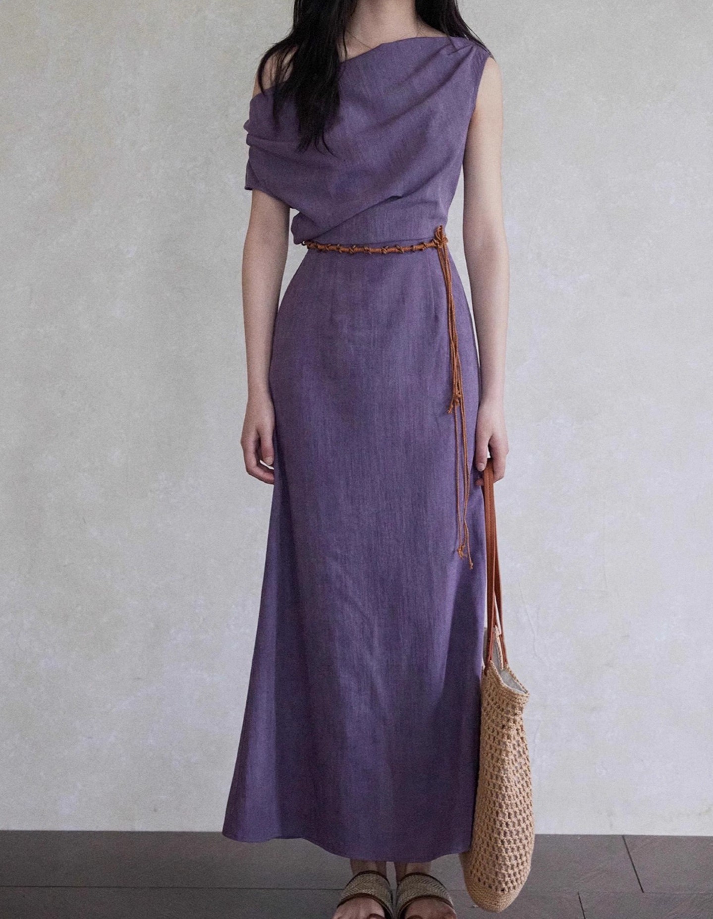 贰羊设计【未央】新中式斜肩荡领连衣裙女气质紫色设计感收腰长裙