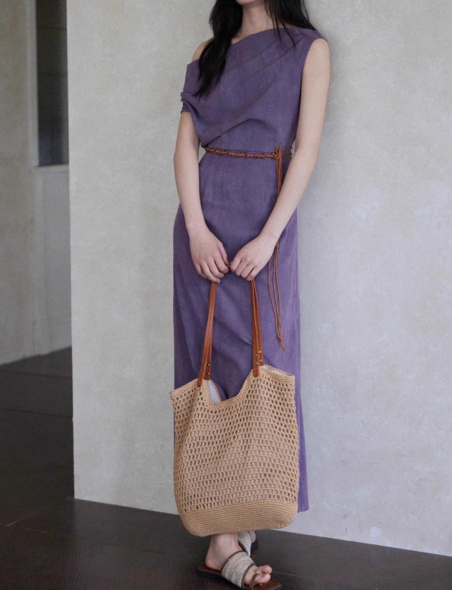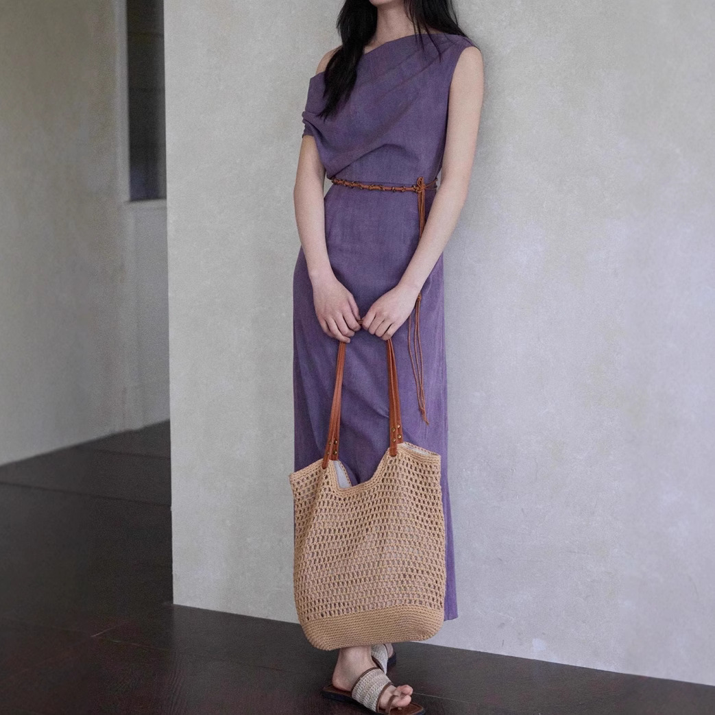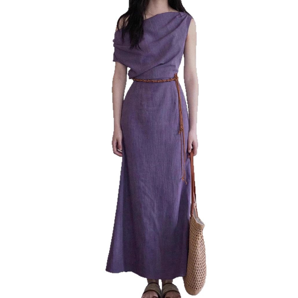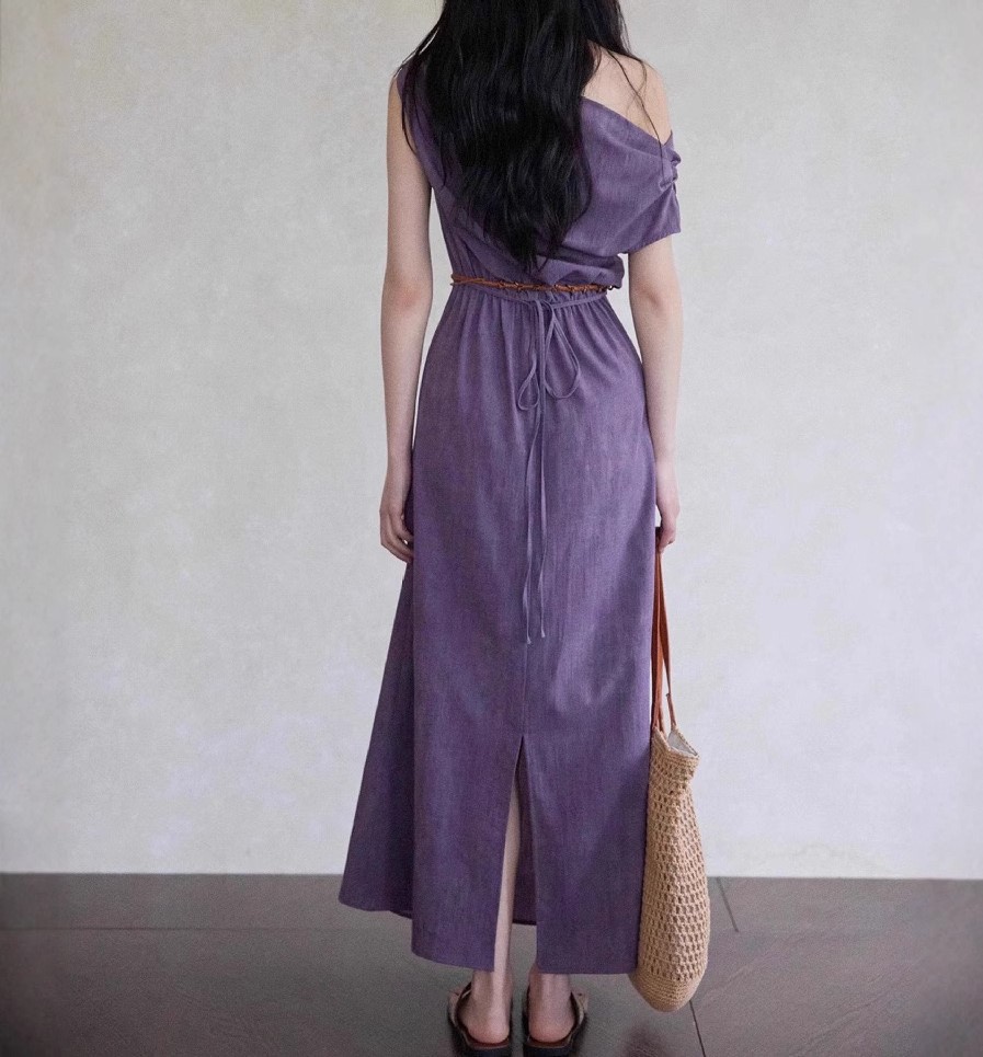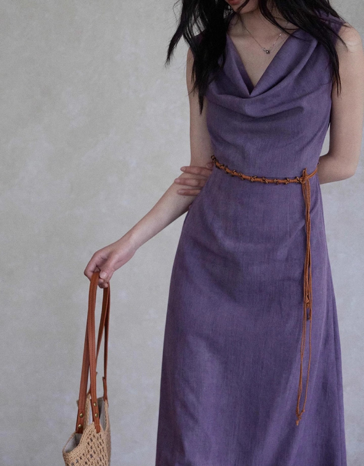 贰羊设计【未央】新中式斜肩荡领连衣裙女气质紫色设计感收腰长裙