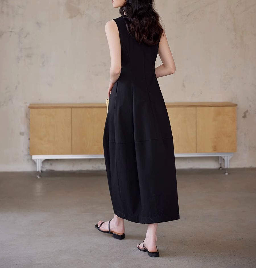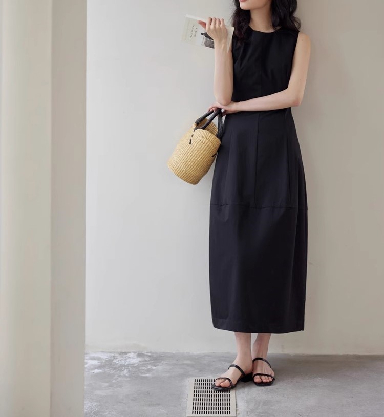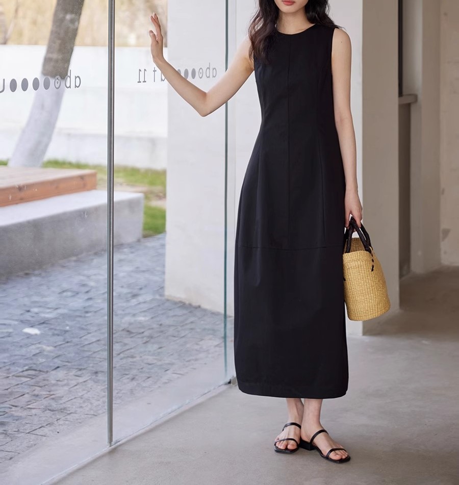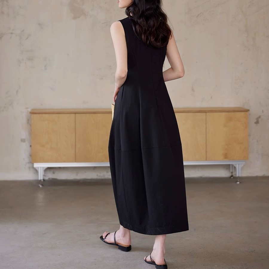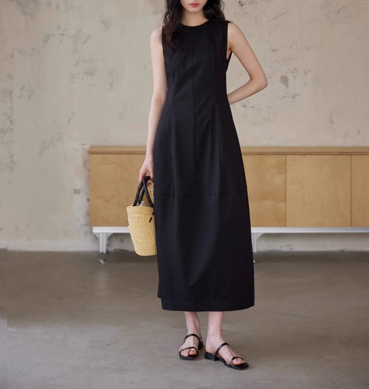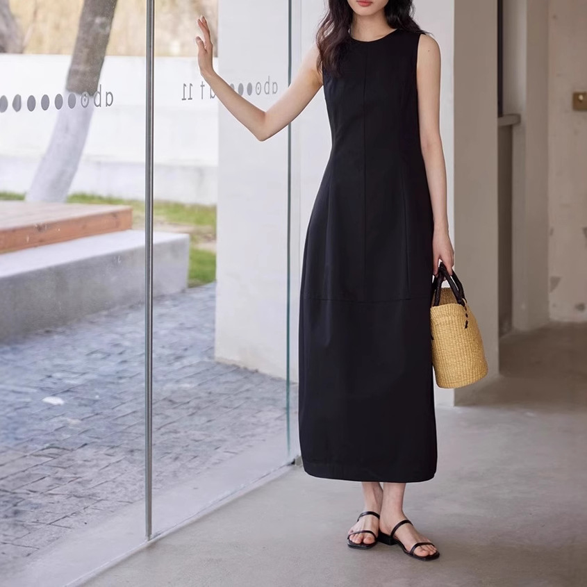 气质小黑裙~法式无袖黑色连衣裙女夏收腰纯色显瘦背心裙花苞裙