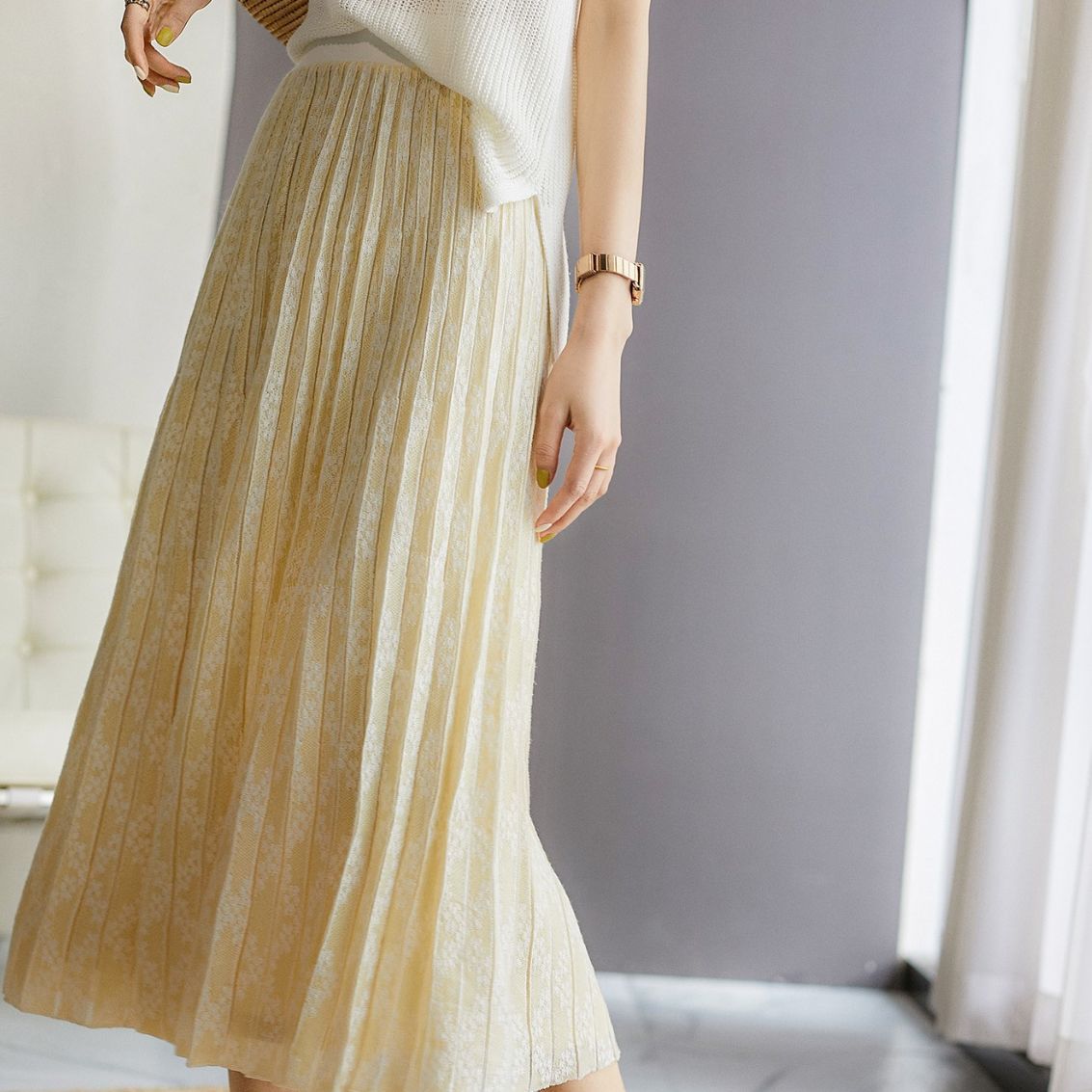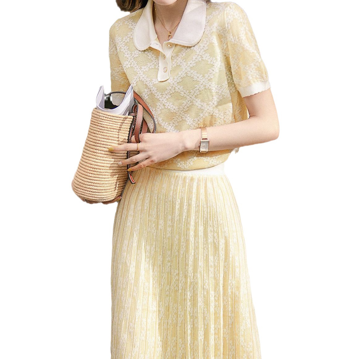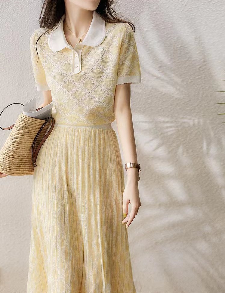 温柔奶油黄娃娃领领型空气提花百褶松紧腰半裙套装多巴胺穿搭
